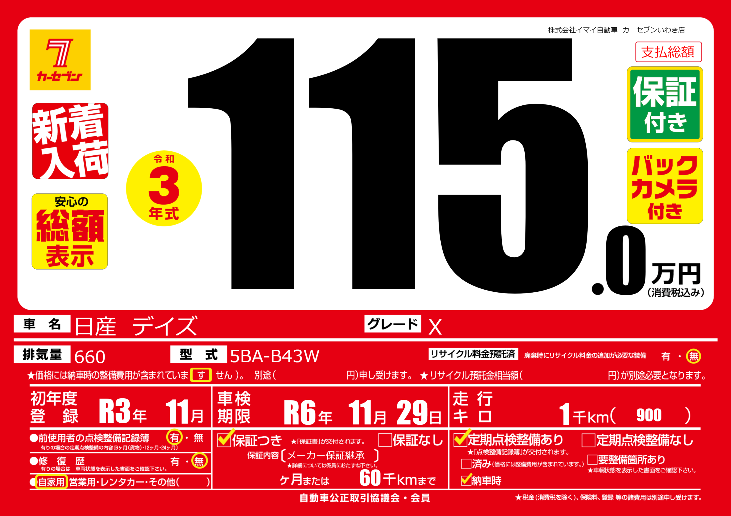 | 車名 | 日産 デイズ | グレード ミッション 排気量 |