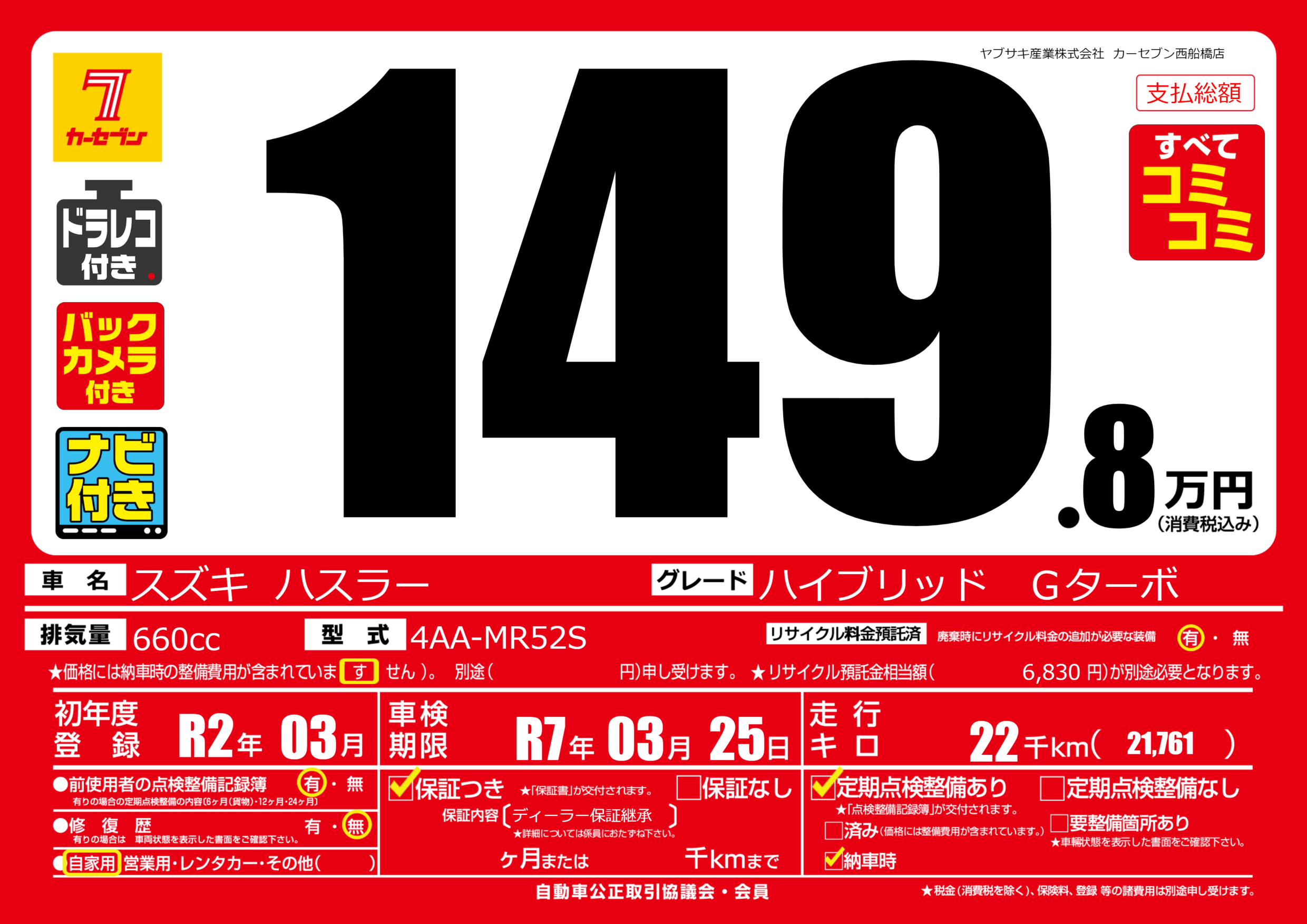 | 走行キロ | 2.2万km | 初年度登録 | R2年03月 |