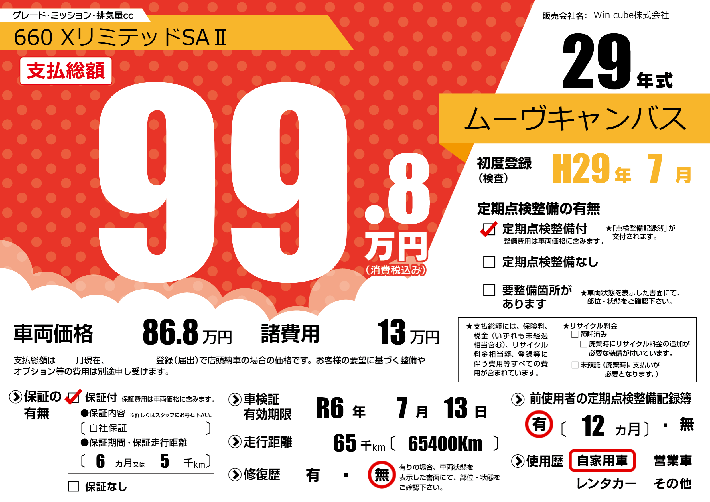 | 車名 | ムーヴキャンバス | グレード ミッション 排気量 |
