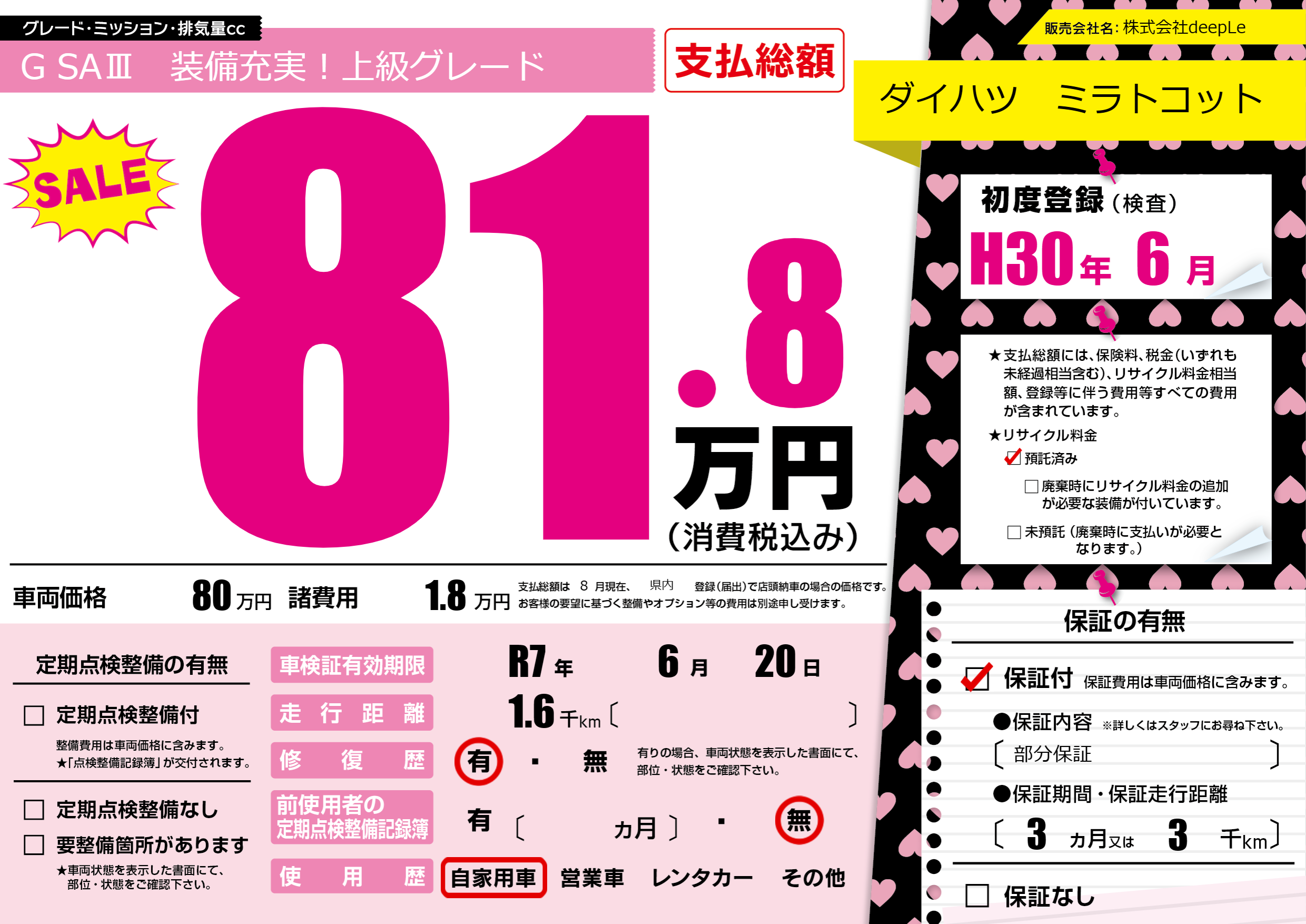 | 走行キロ | 0.1万km | 初年度登録 | H30年6月 |