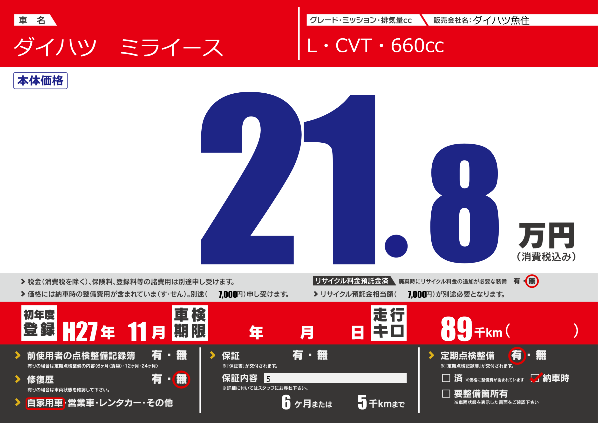 | 定期点検整備 | 定期点検整備あり 納車時あり | ||