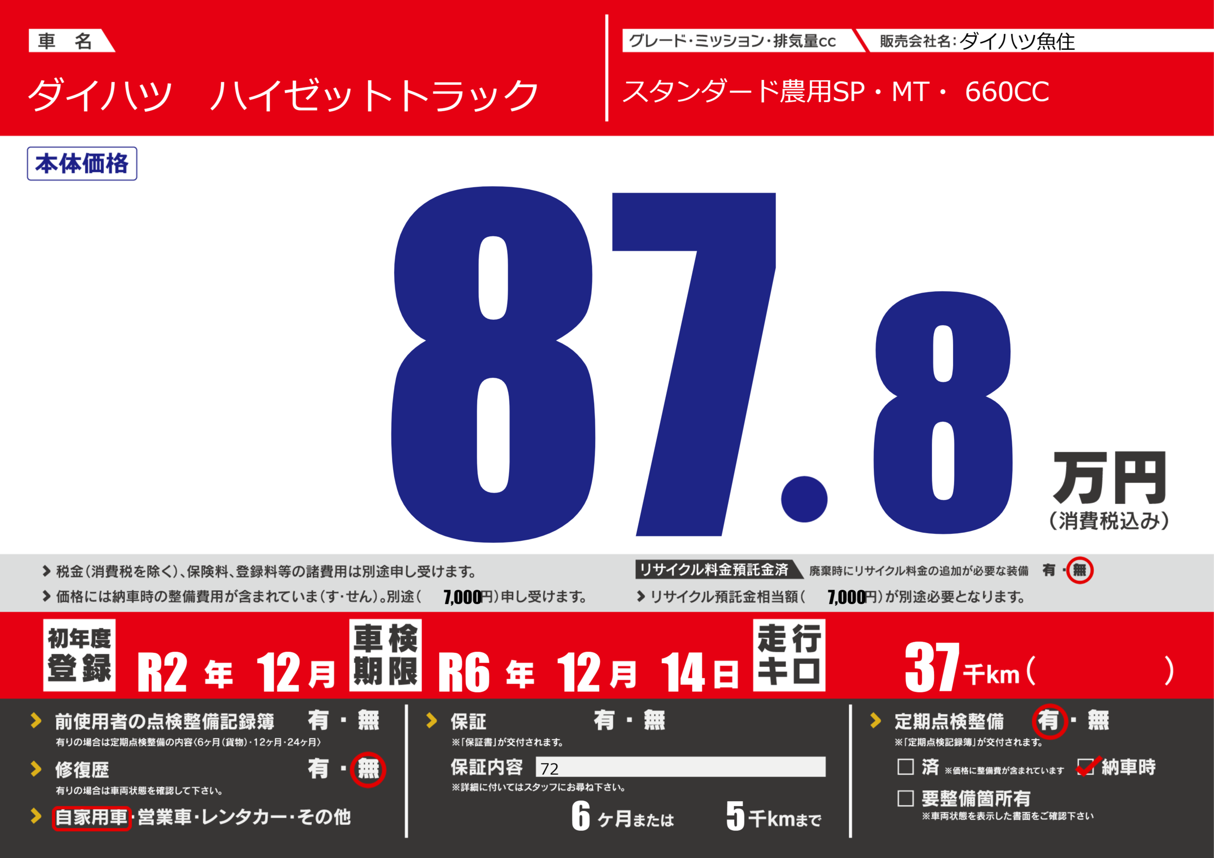 保証なし 保証内容(72) 6ヶ月または(5)千kmまで |