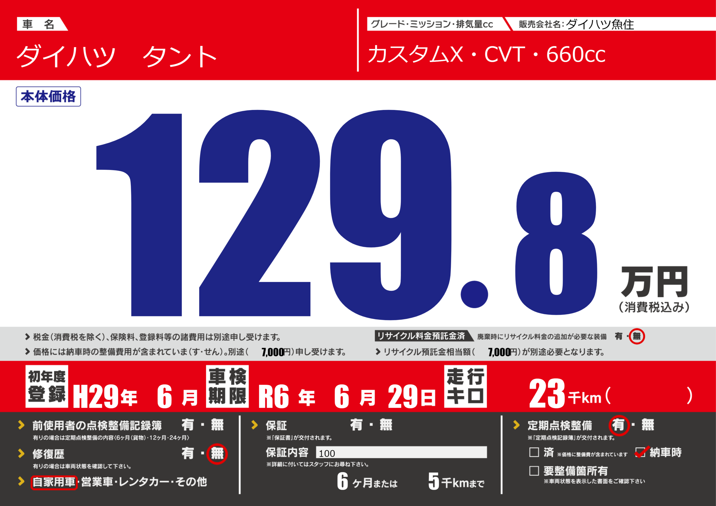 | 車名 | ダイハツ タント | グレード ミッション 排気量 |