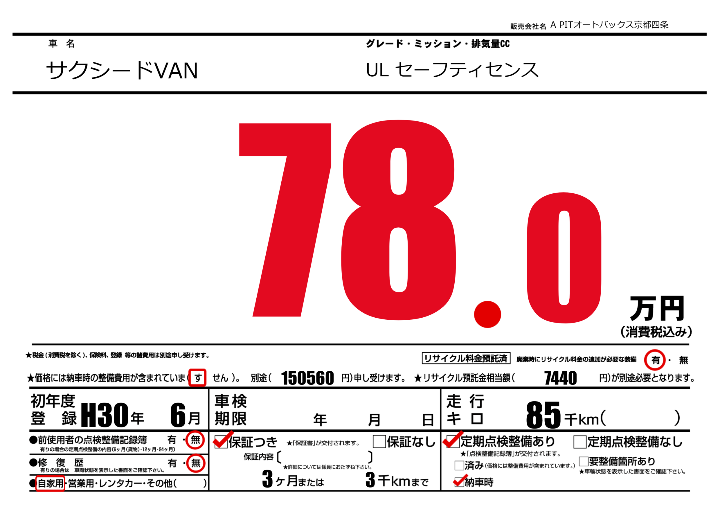 保証なし 保証内容(---) 3ヶ月または(3)千kmまで |