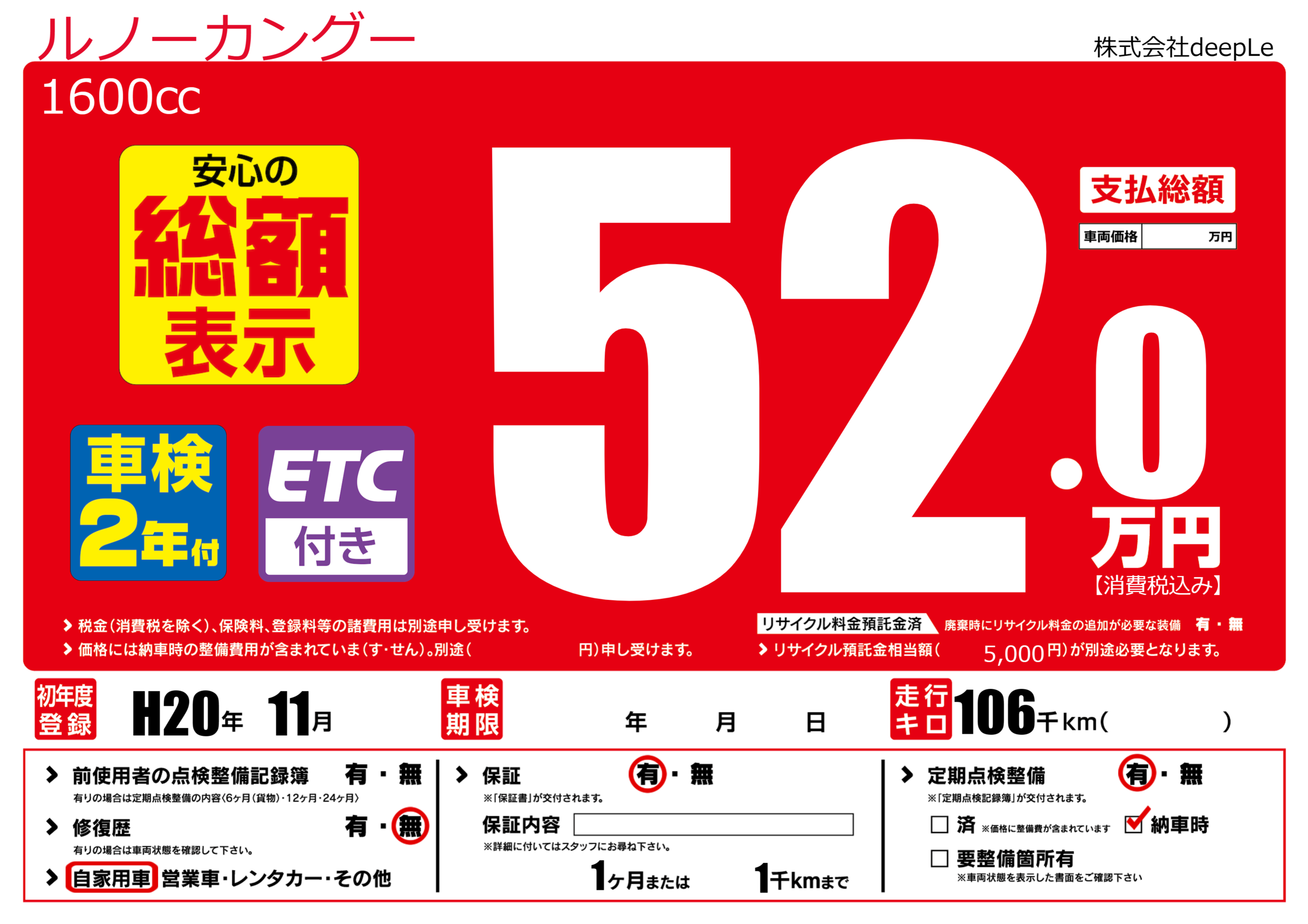 | 車名 | ルノーカングー | グレード ミッション 排気量 |