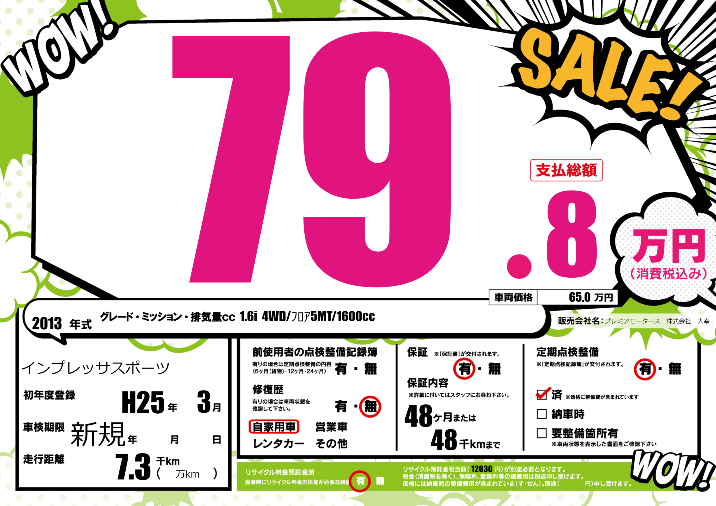 | 車名 | インプレッサスポーツ | グレード ミッション 排気量 |
