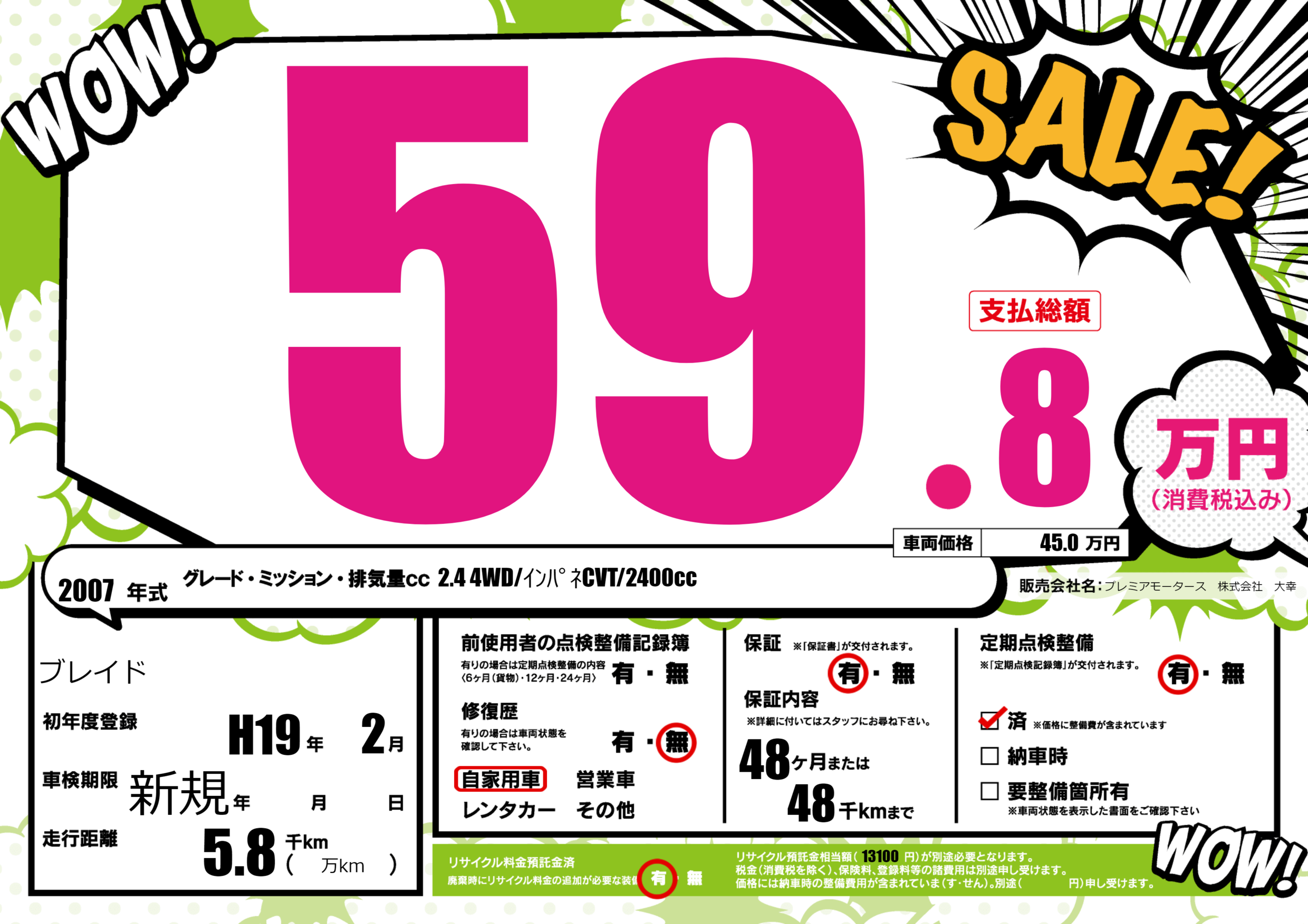| 車名 | ブレイド | グレード ミッション 排気量 |
