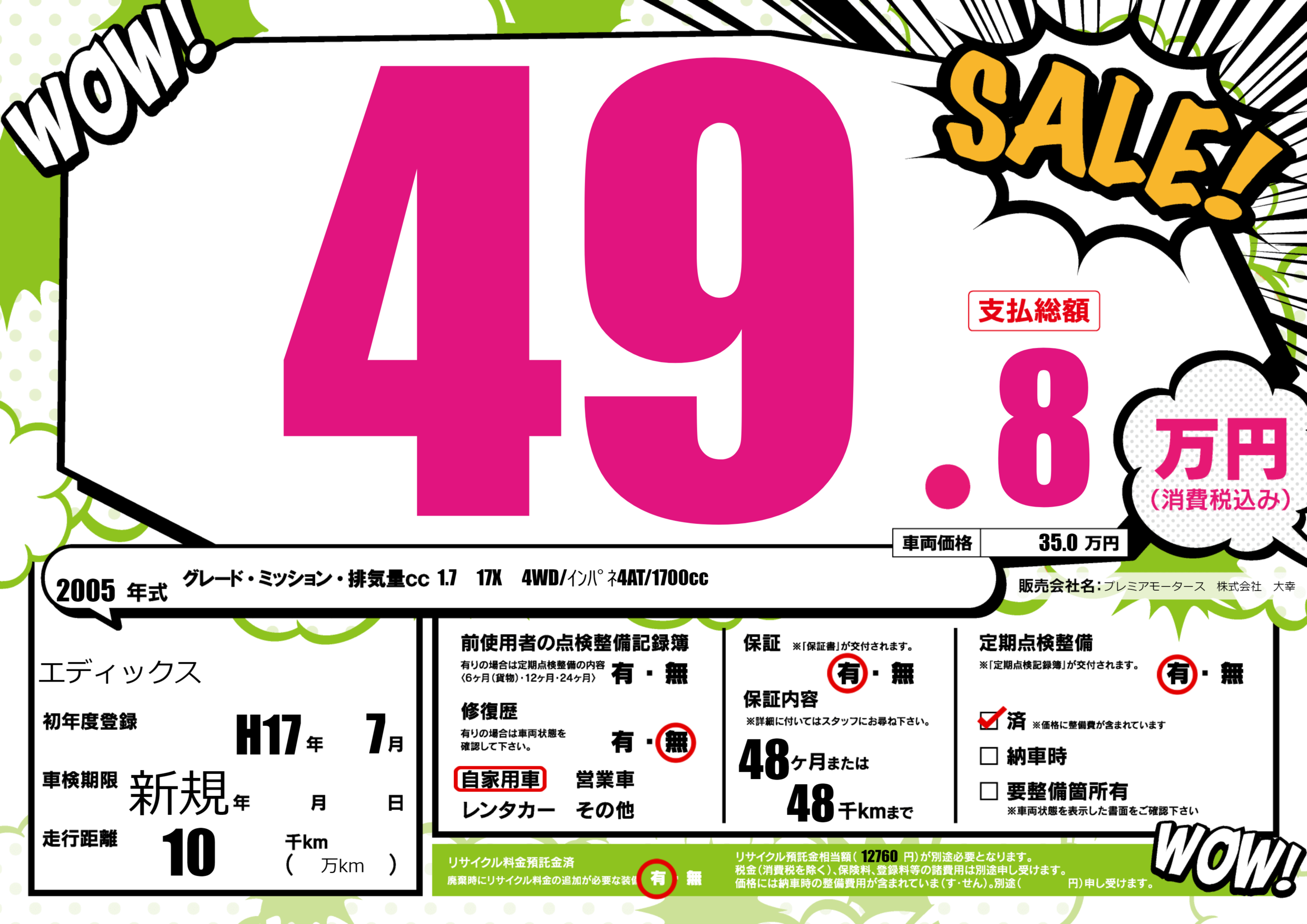 | 車名 | エディックス | グレード ミッション 排気量 |