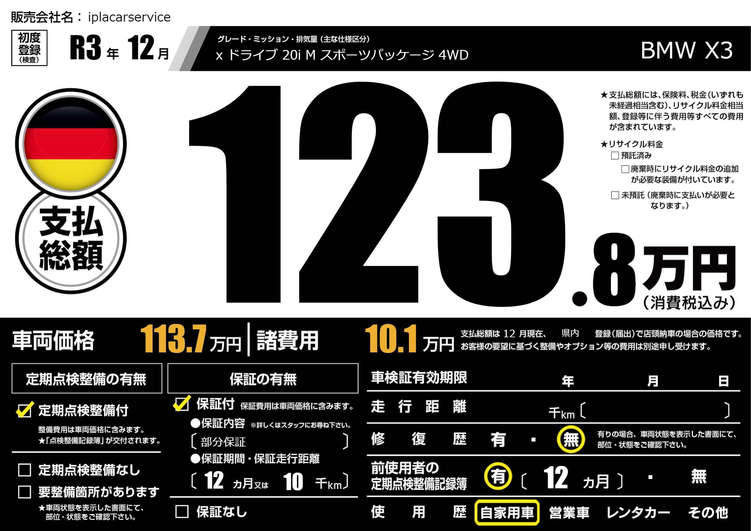 | 車名 | x ドライブ 20i M スポーツパッケージ 4WD | グレード ミッション 排気量 |