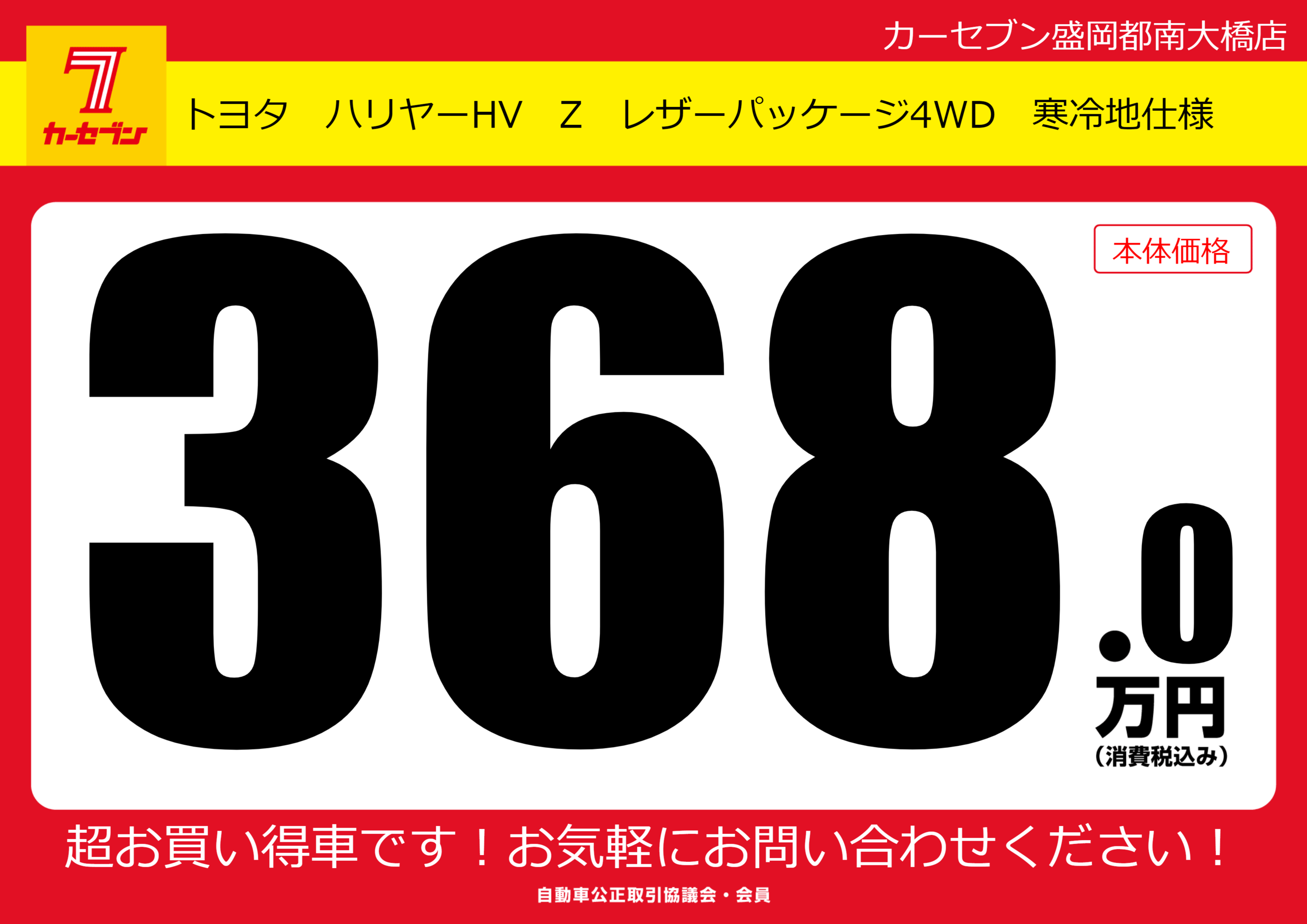 | 車名 | トヨタ ハリヤーHV Z レザーパッケージ4WD 寒冷地仕様 | グレード ミッション 排気量 |