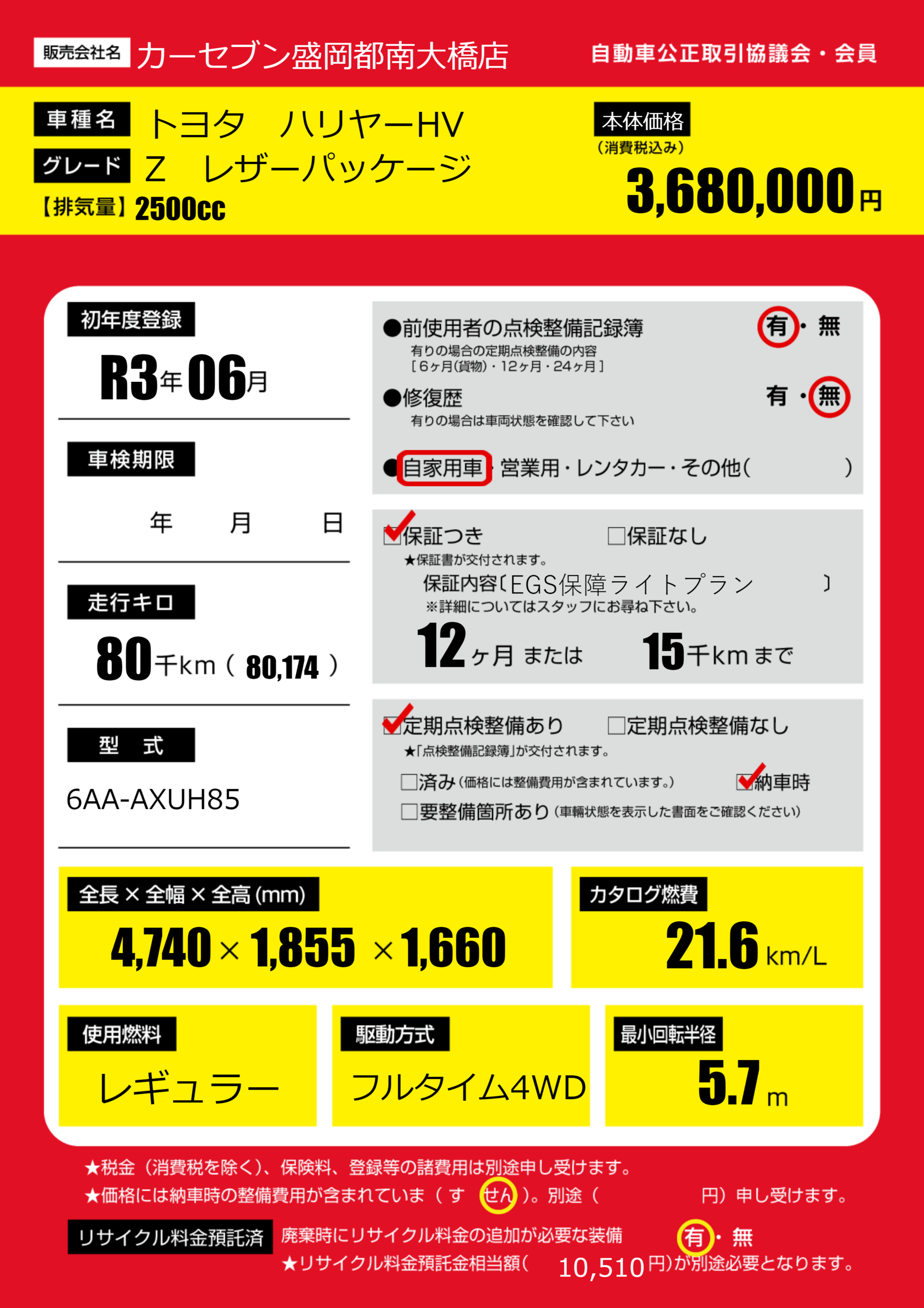 | 走行キロ | 8万km | 初年度登録 | R3年06月 |