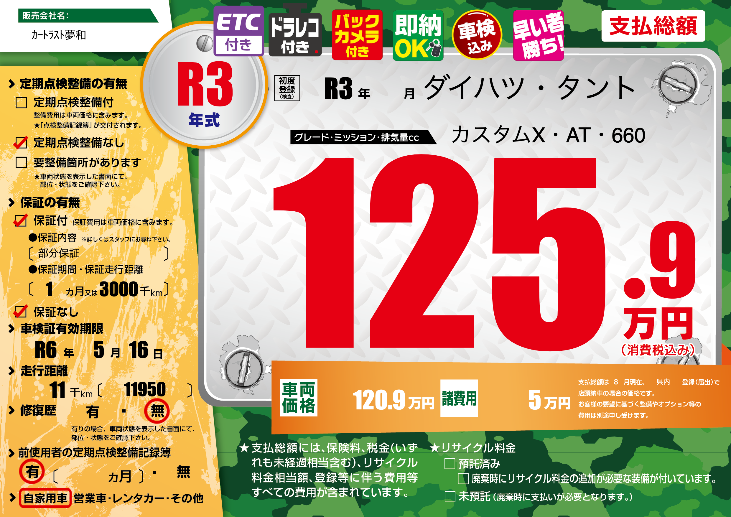 | 車名 | ダイハツ・タント | グレード ミッション 排気量 |