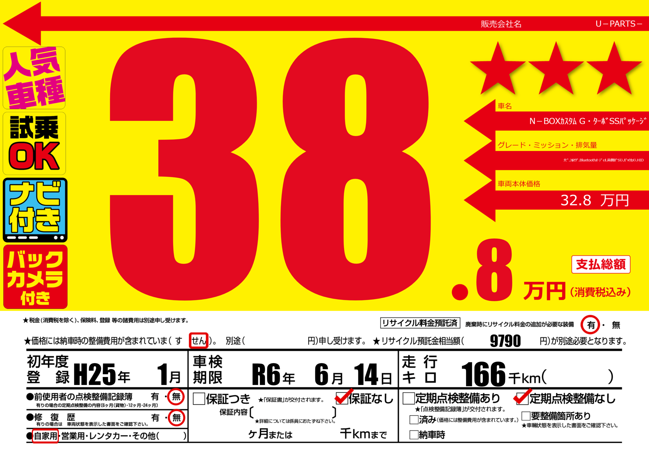 | 車名 | N-BOXカスタム G・ターボSSパッケージ | グレード ミッション 排気量 |