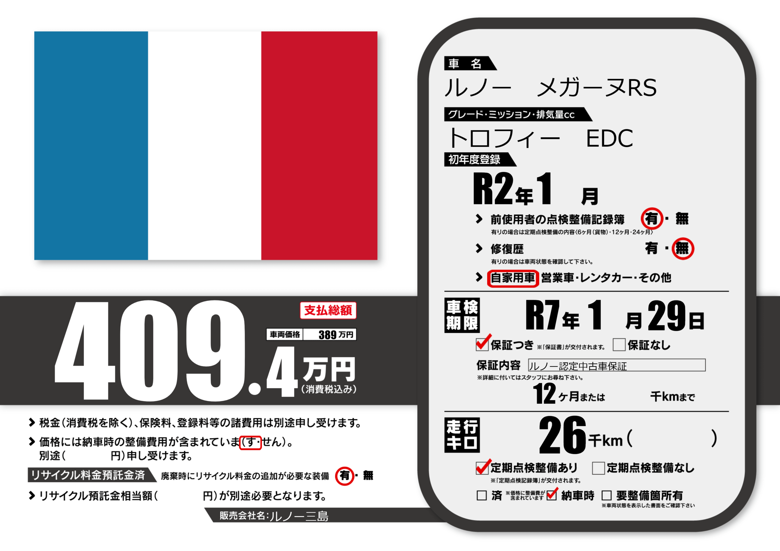 保証なし 保証内容(ルノー認定中古車保証) 12ヶ月または千km |