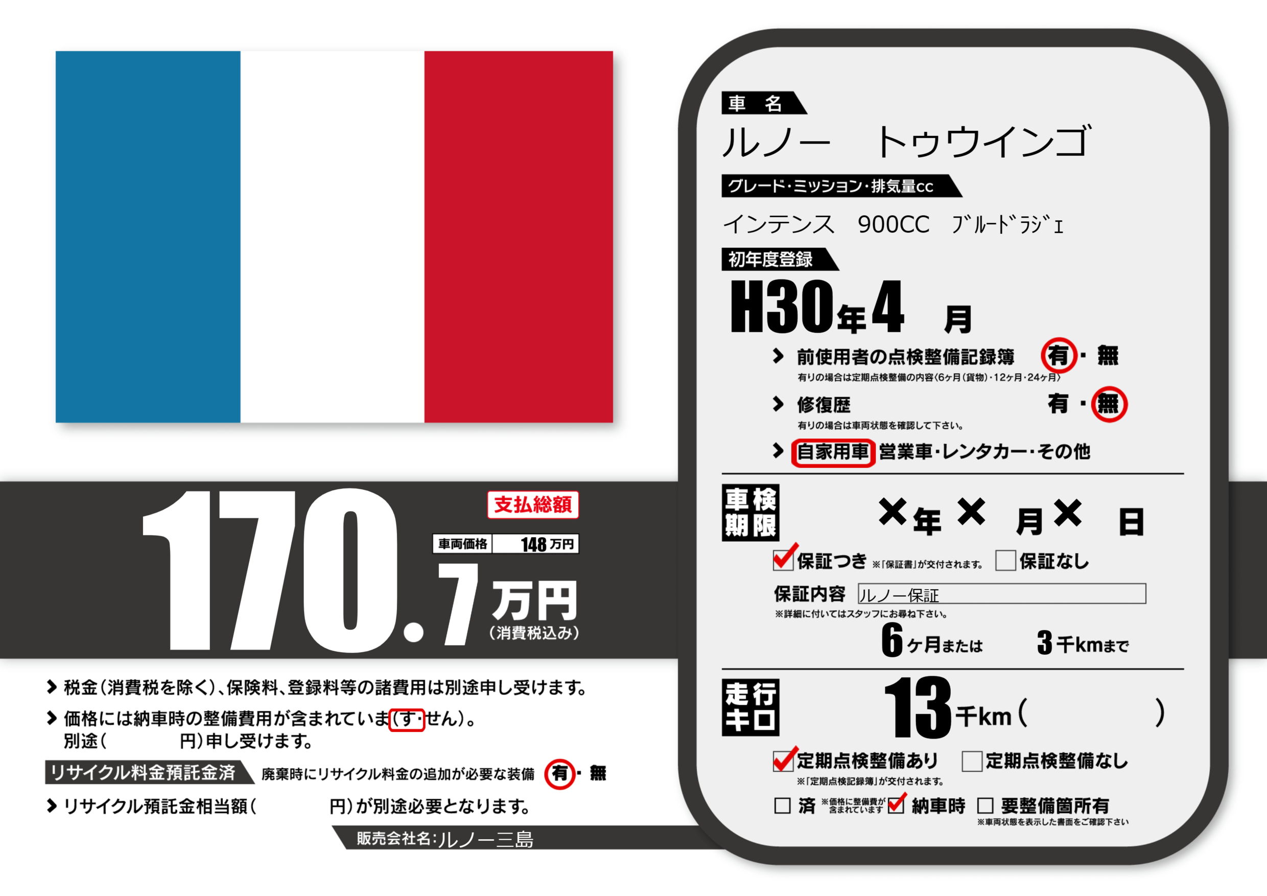 保証なし 保証内容(ルノー保証) 6ヶ月または(3)千kmまで |