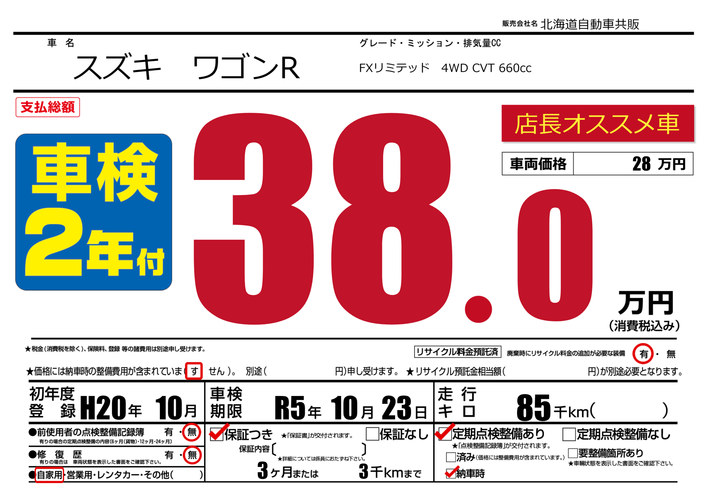 | 走行キロ | 8.5万km | 初年度登録 | H20年10月 |