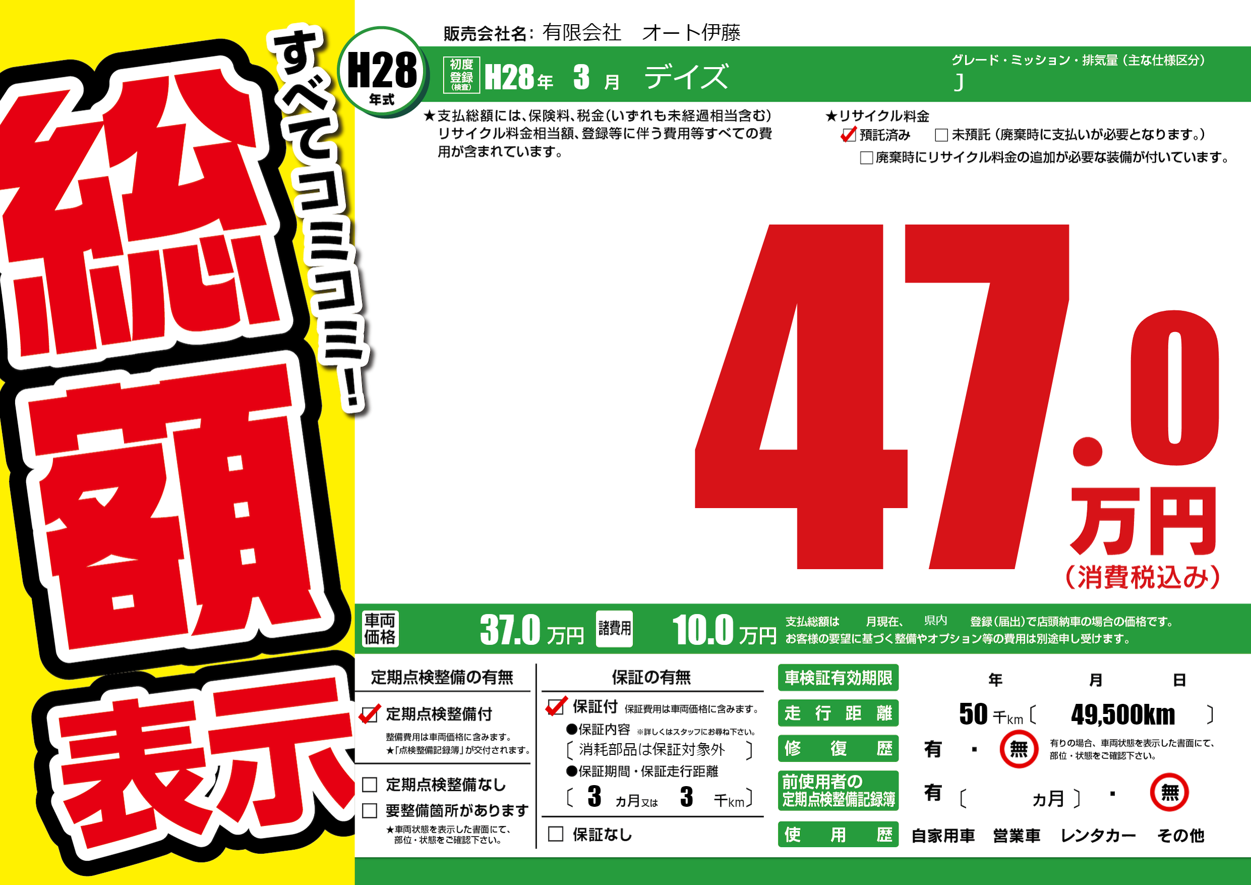 | 車名 | デイズ | グレード ミッション 排気量 |