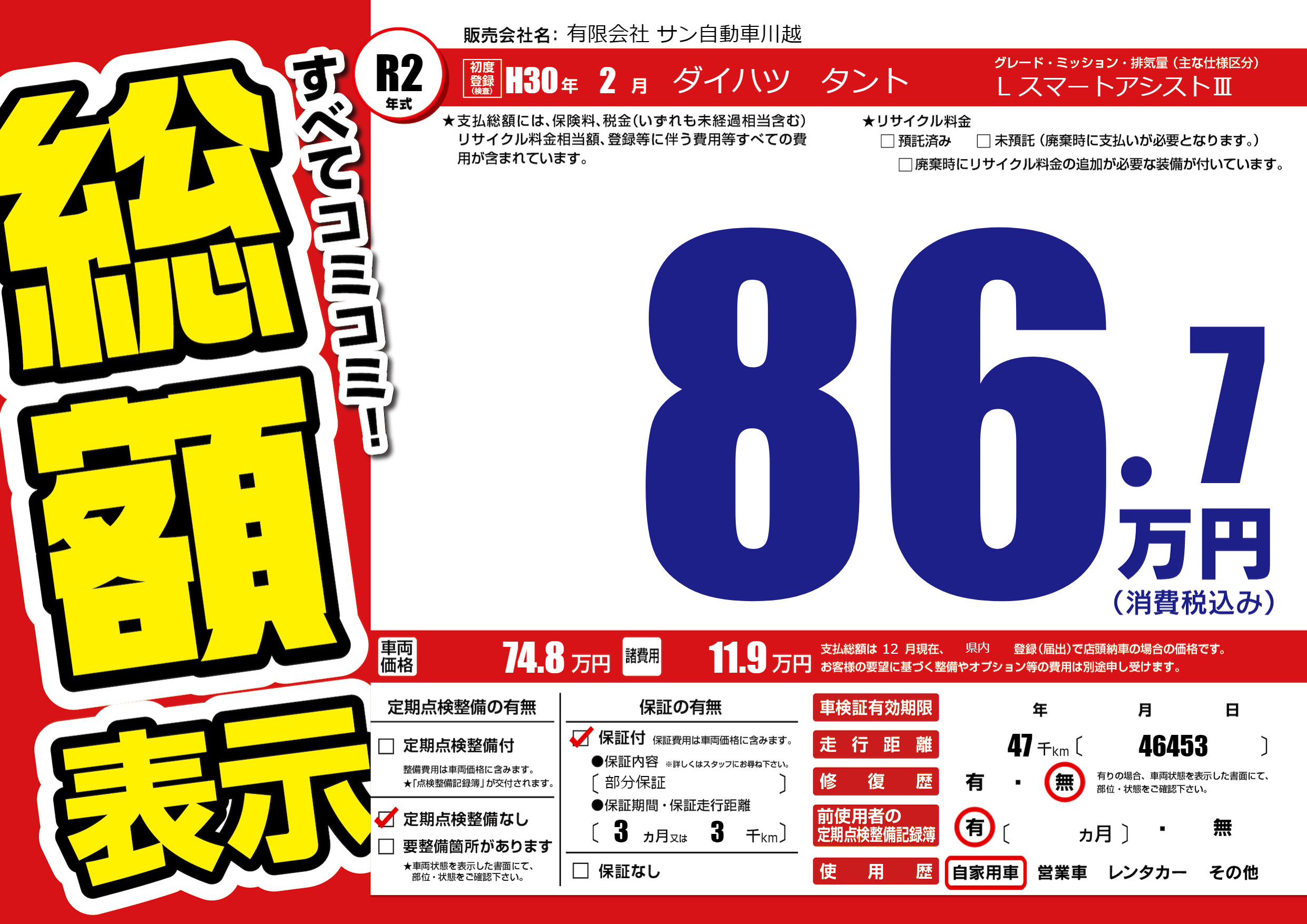 | 車名 | ダイハツ タント | グレード ミッション 排気量 |