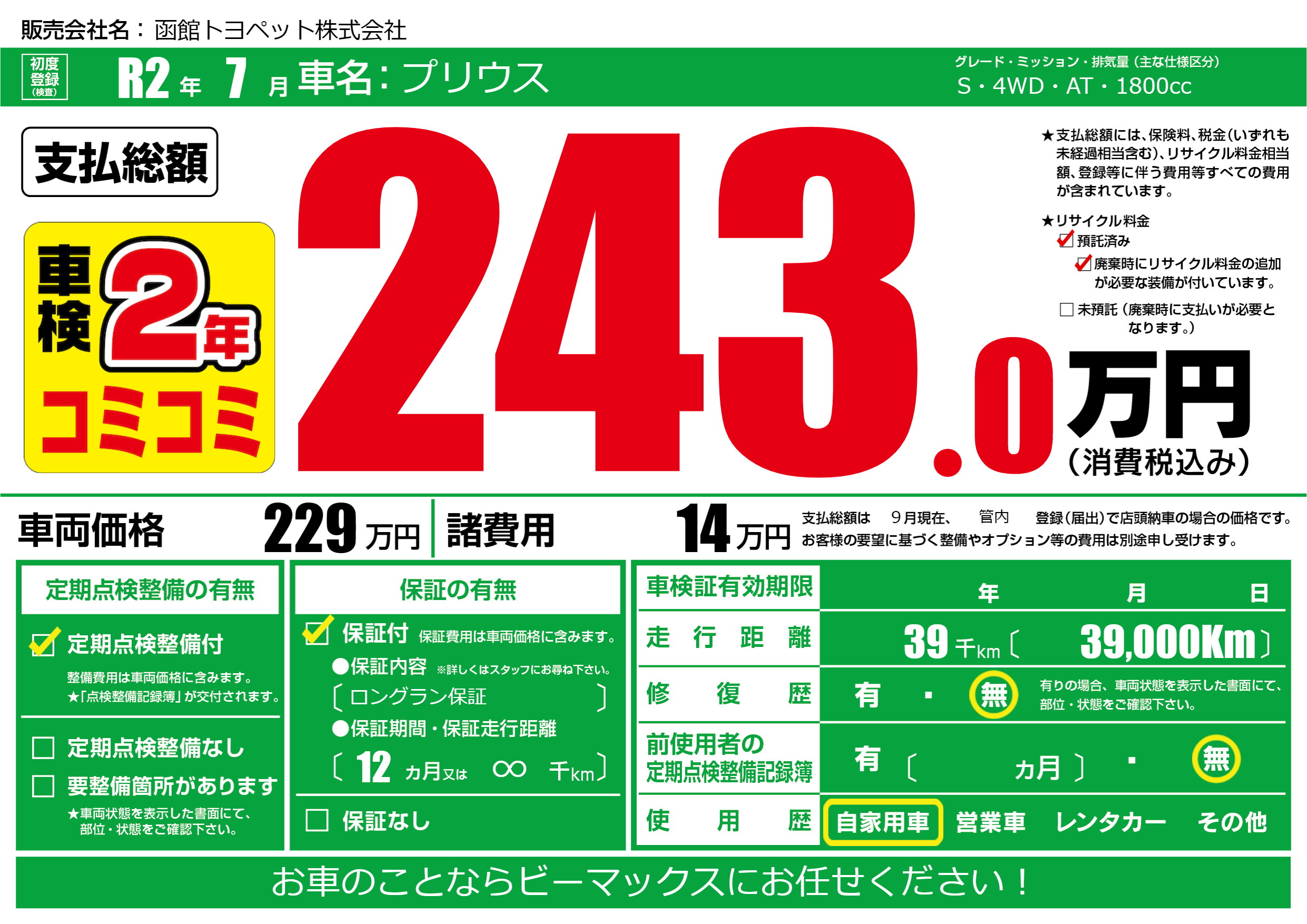 | 走行キロ | 3.9万km | 初年度登録 | R2年7月 |
