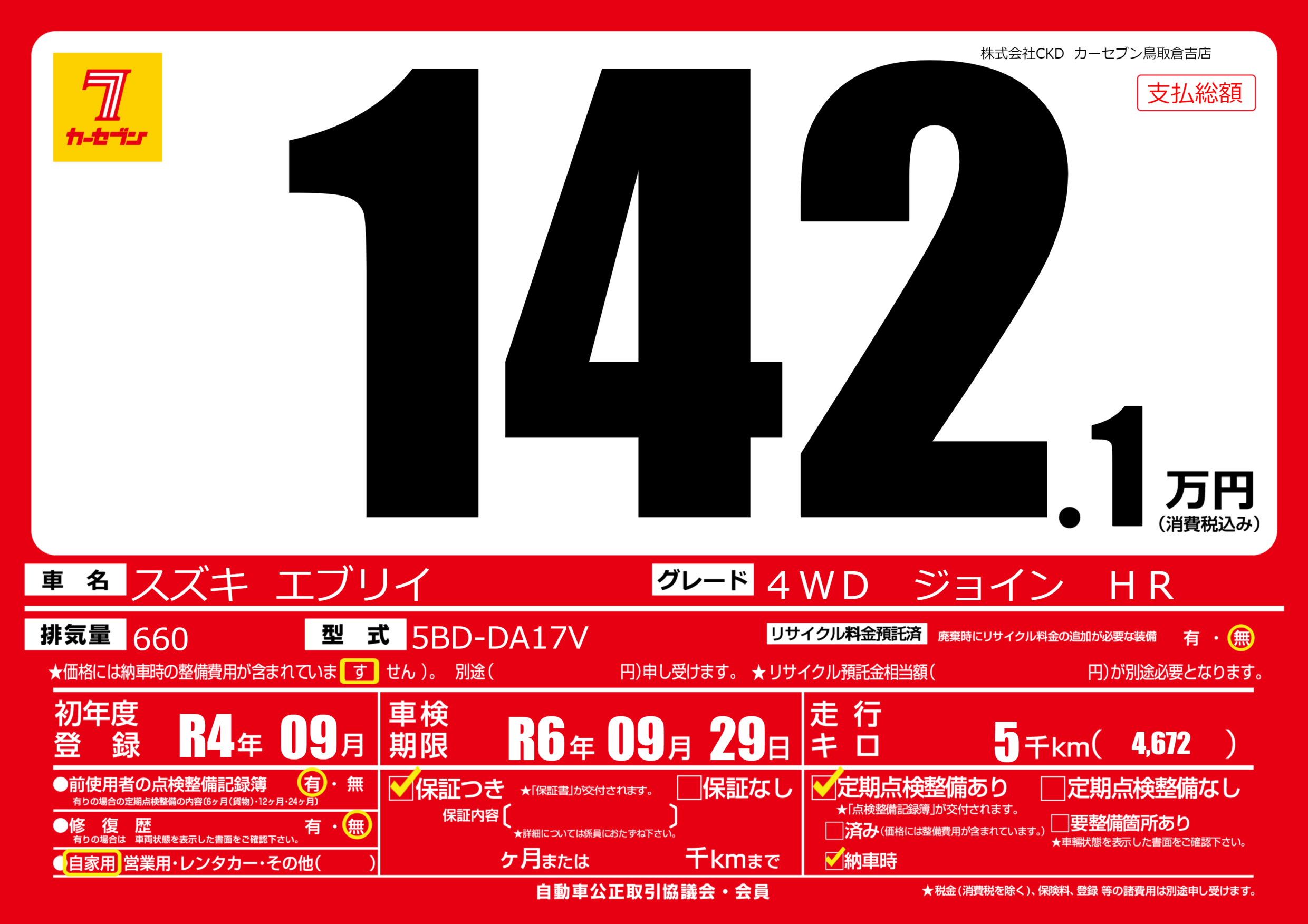 | 定期点検整備 | 定期点検整備あり 納車時あり | ||