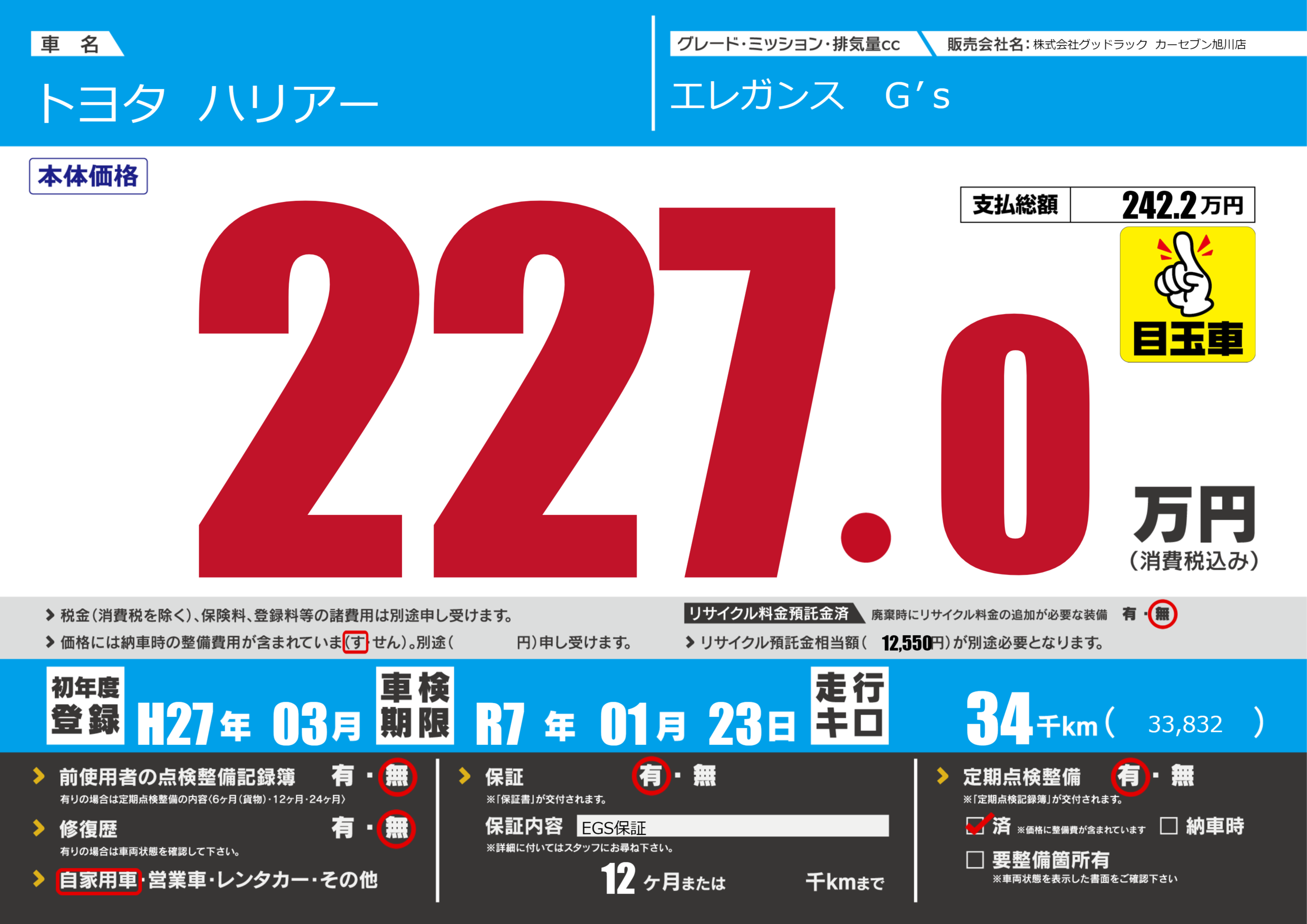 | 車名 | トヨタ ハリアー | グレード ミッション 排気量 |
