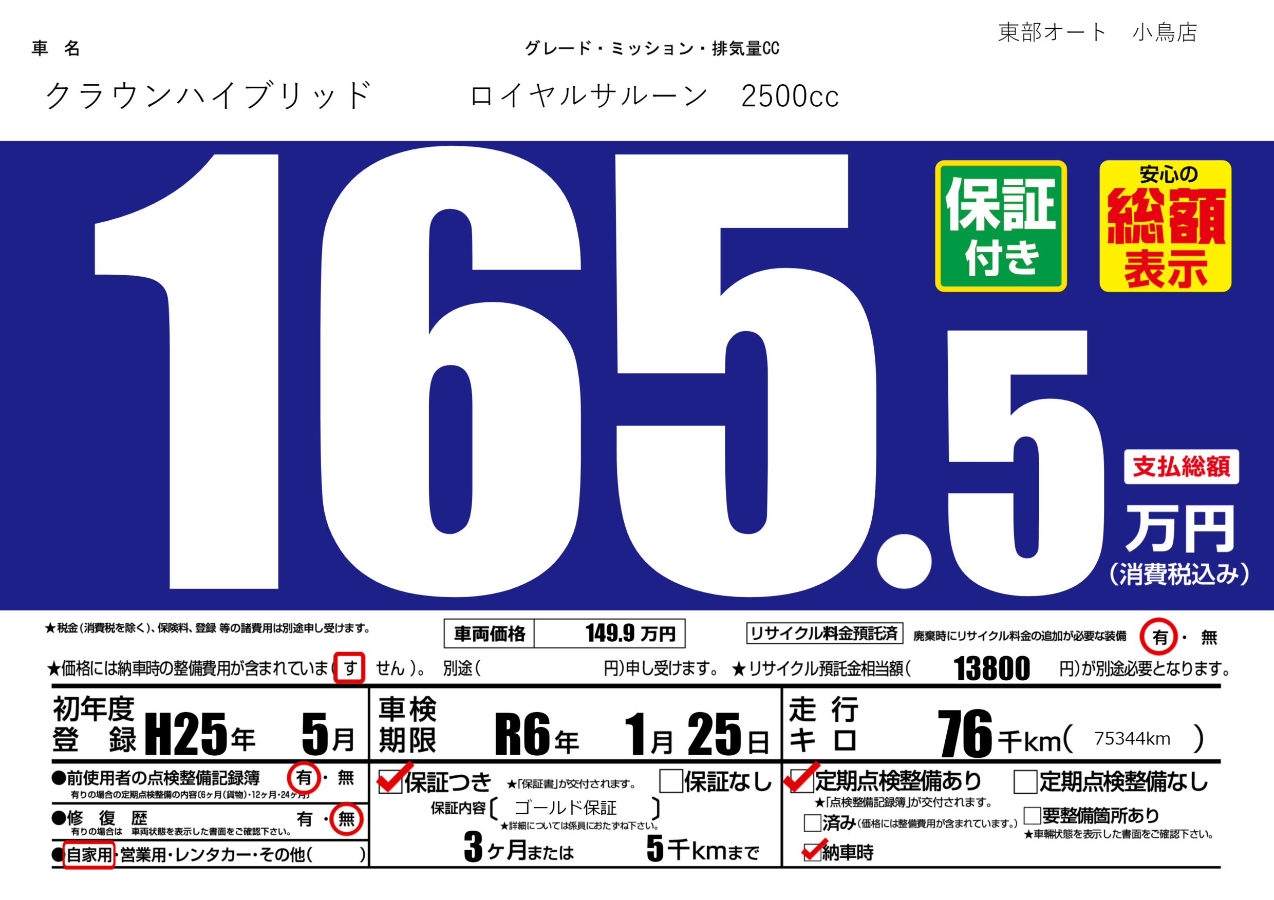 | 車名 | クラウンハイブリッド | グレード ミッション 排気量 |