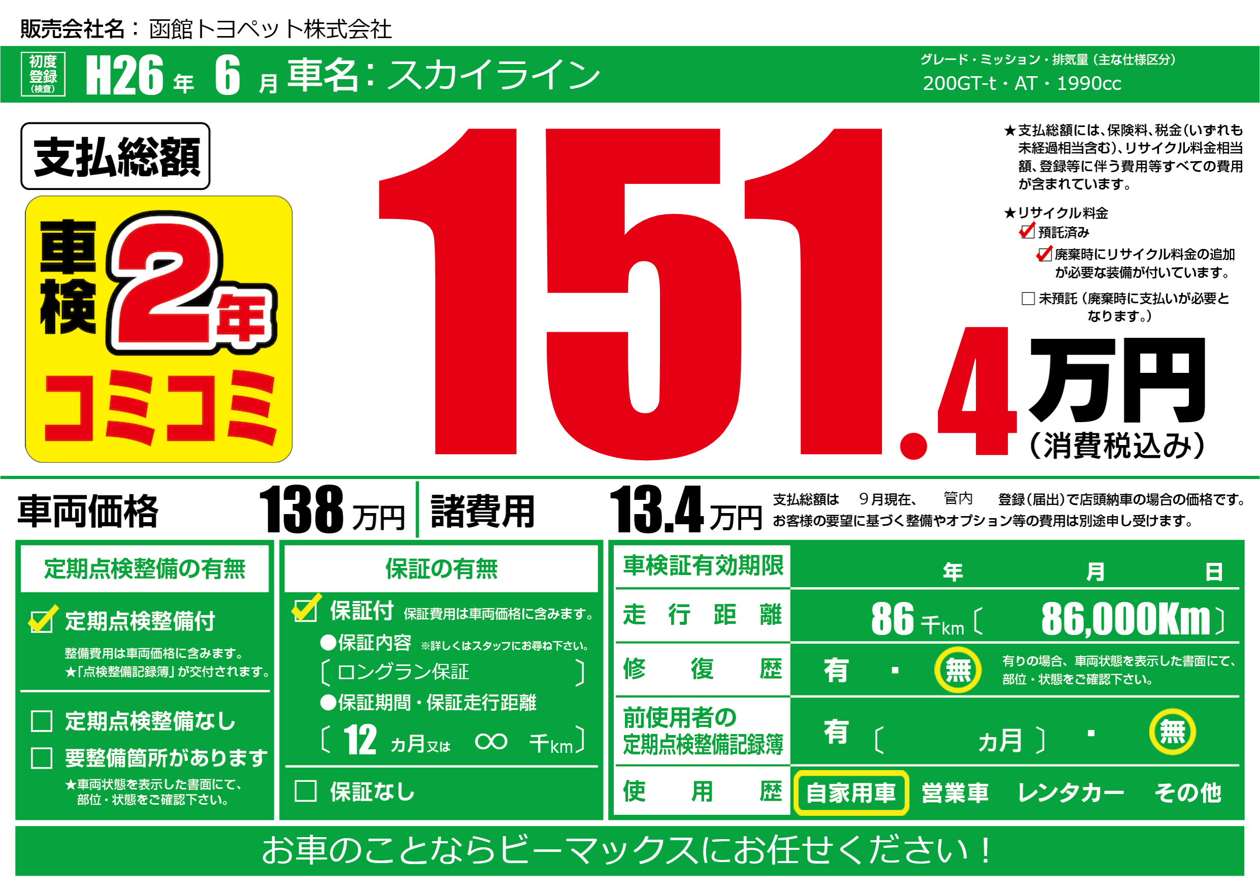 | 走行キロ | 8.6万km | 初年度登録 | H26年6月 |