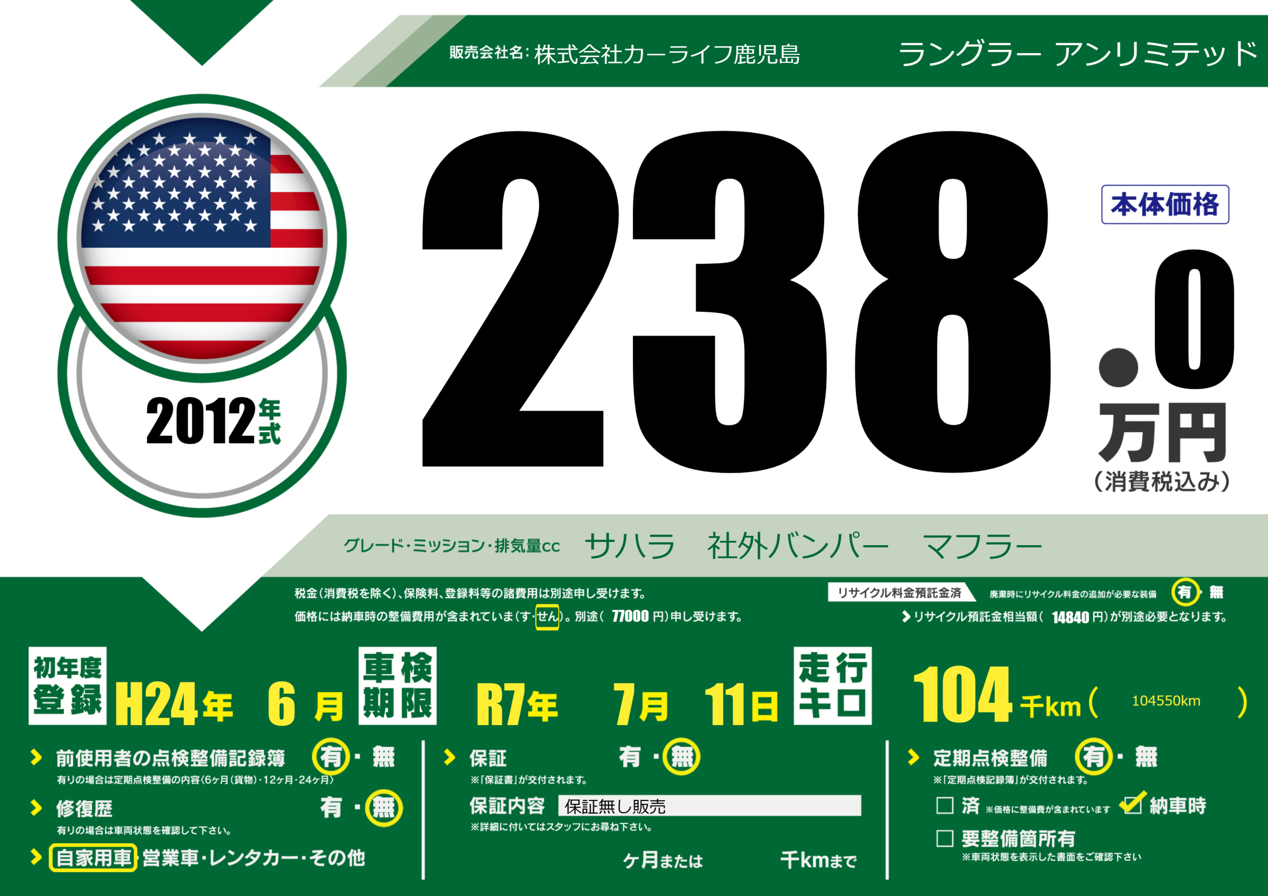 保証なし 保証内容(保証無し販売) ---ヶ月または()千kmまで |