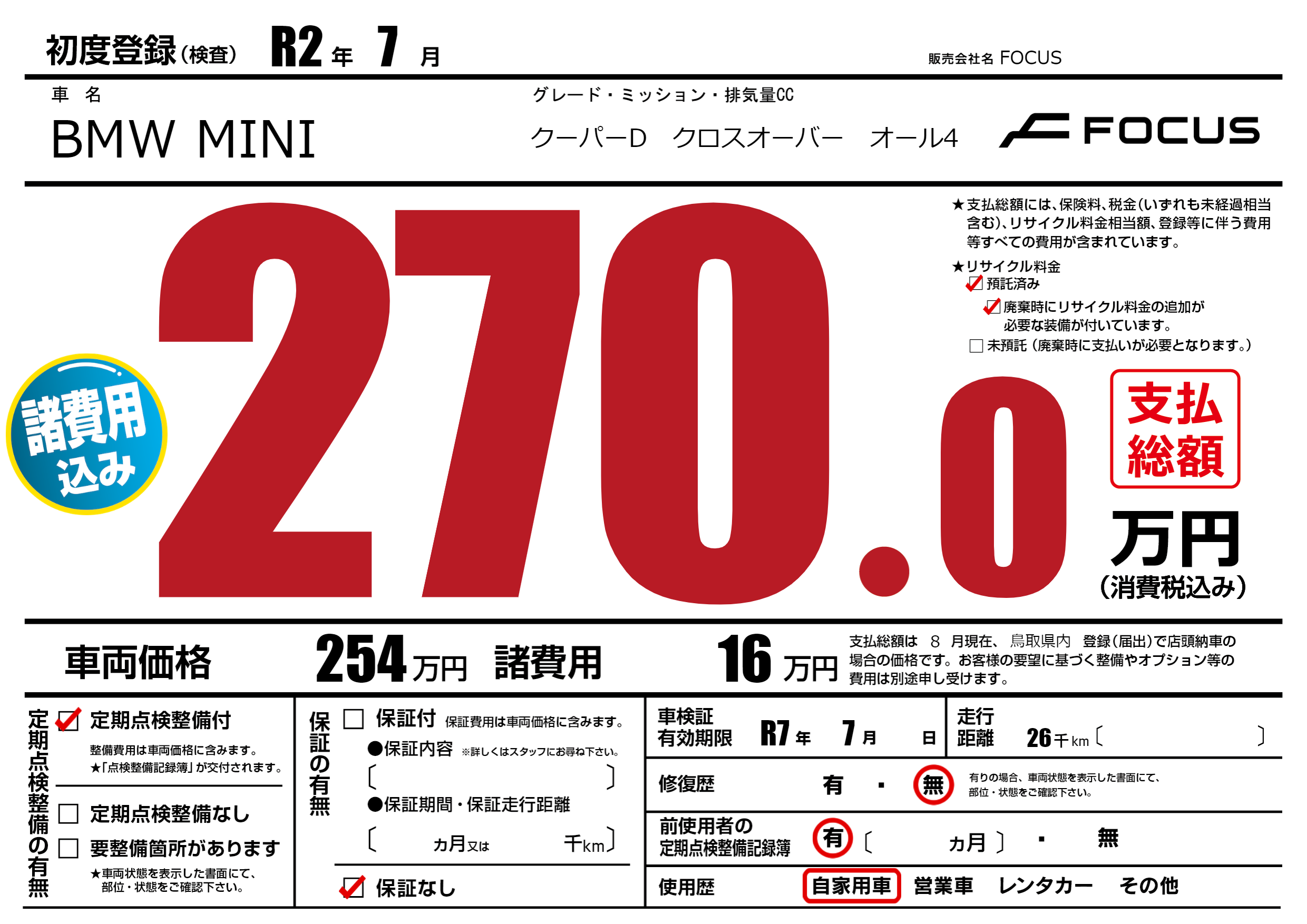 | 車名 | BMW MINI | グレード ミッション 排気量 |