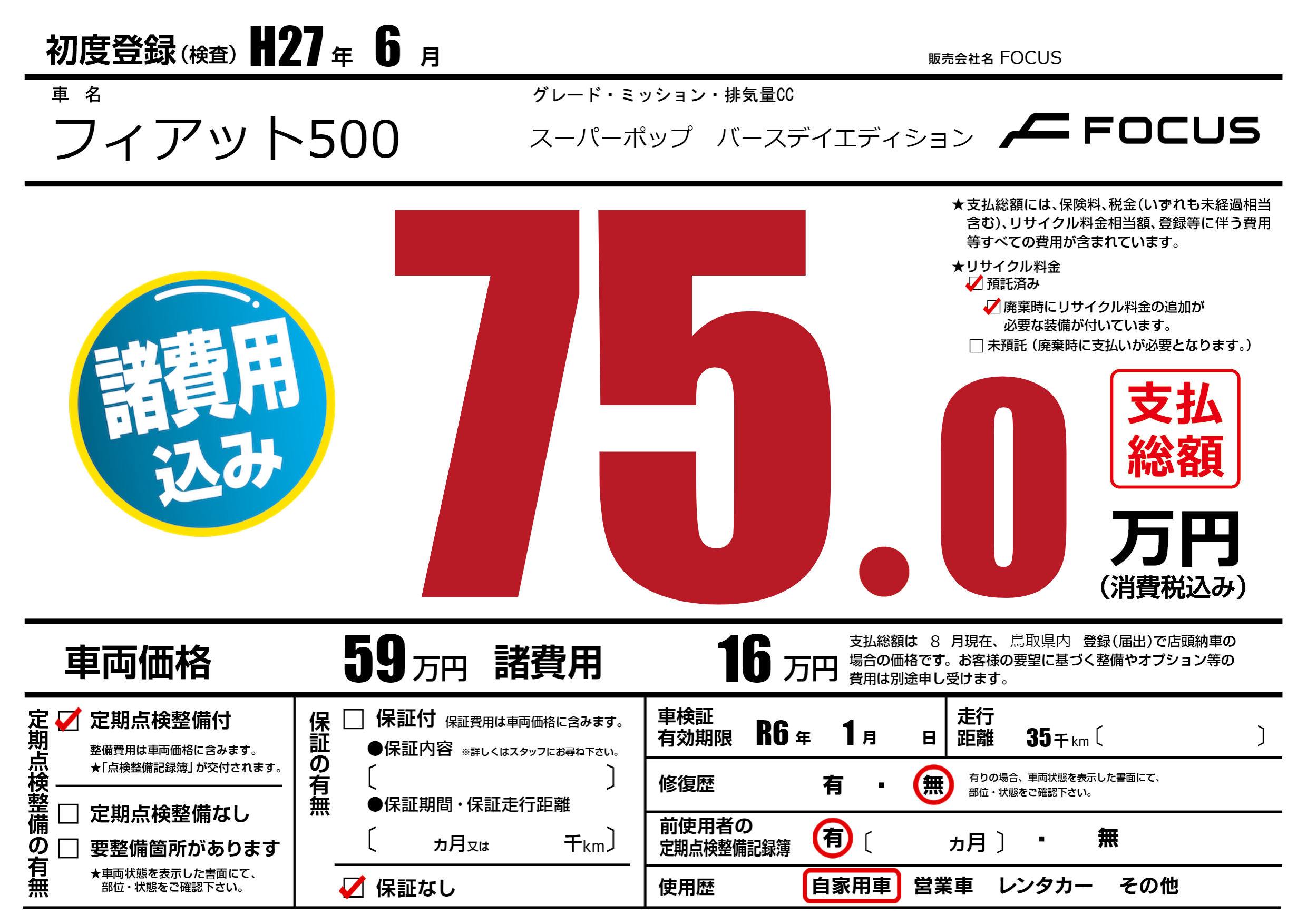 | 車名 | フィアット500 | グレード ミッション 排気量 |