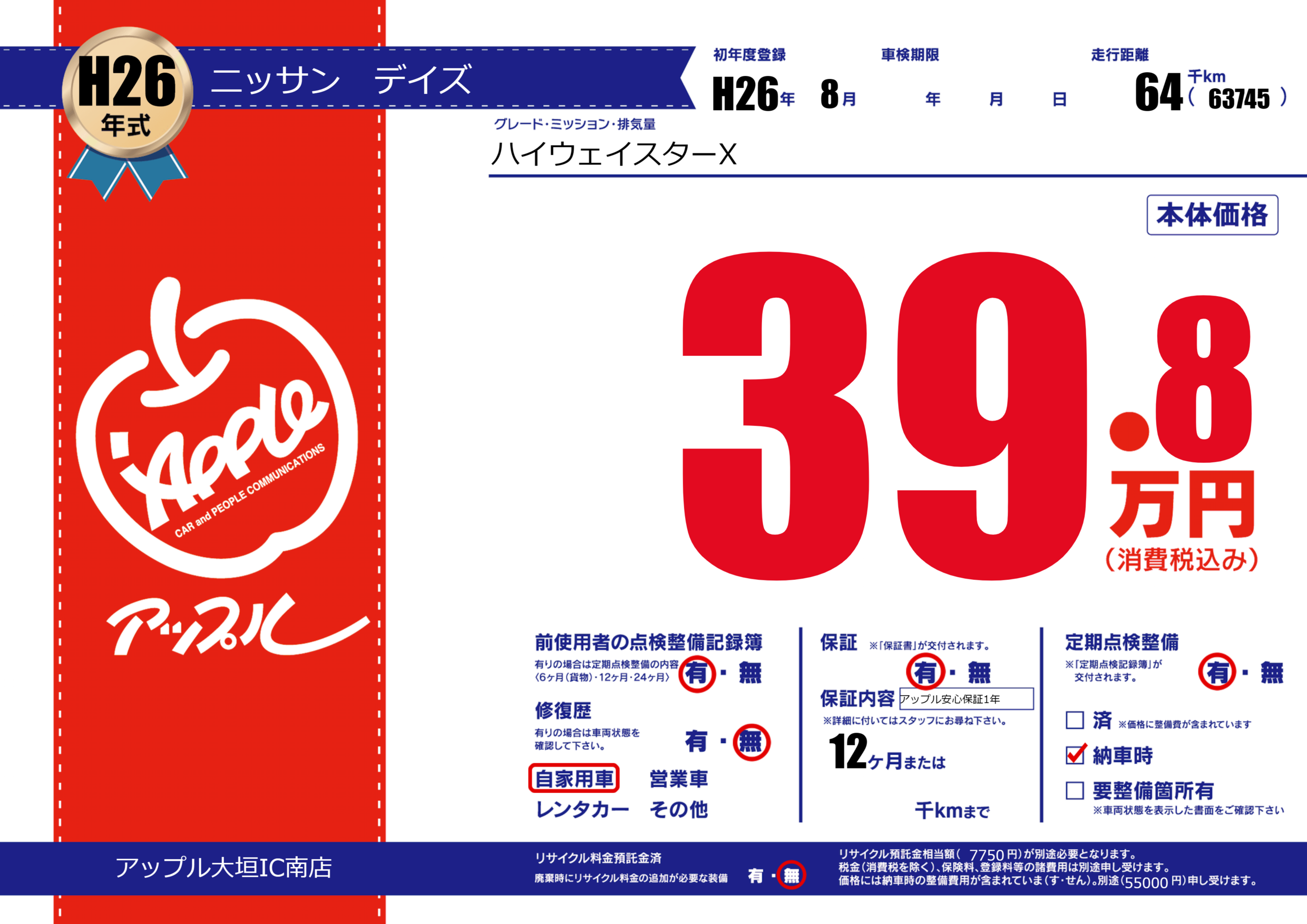 | 車名 | ニッサン デイズ | グレード ミッション 排気量 |