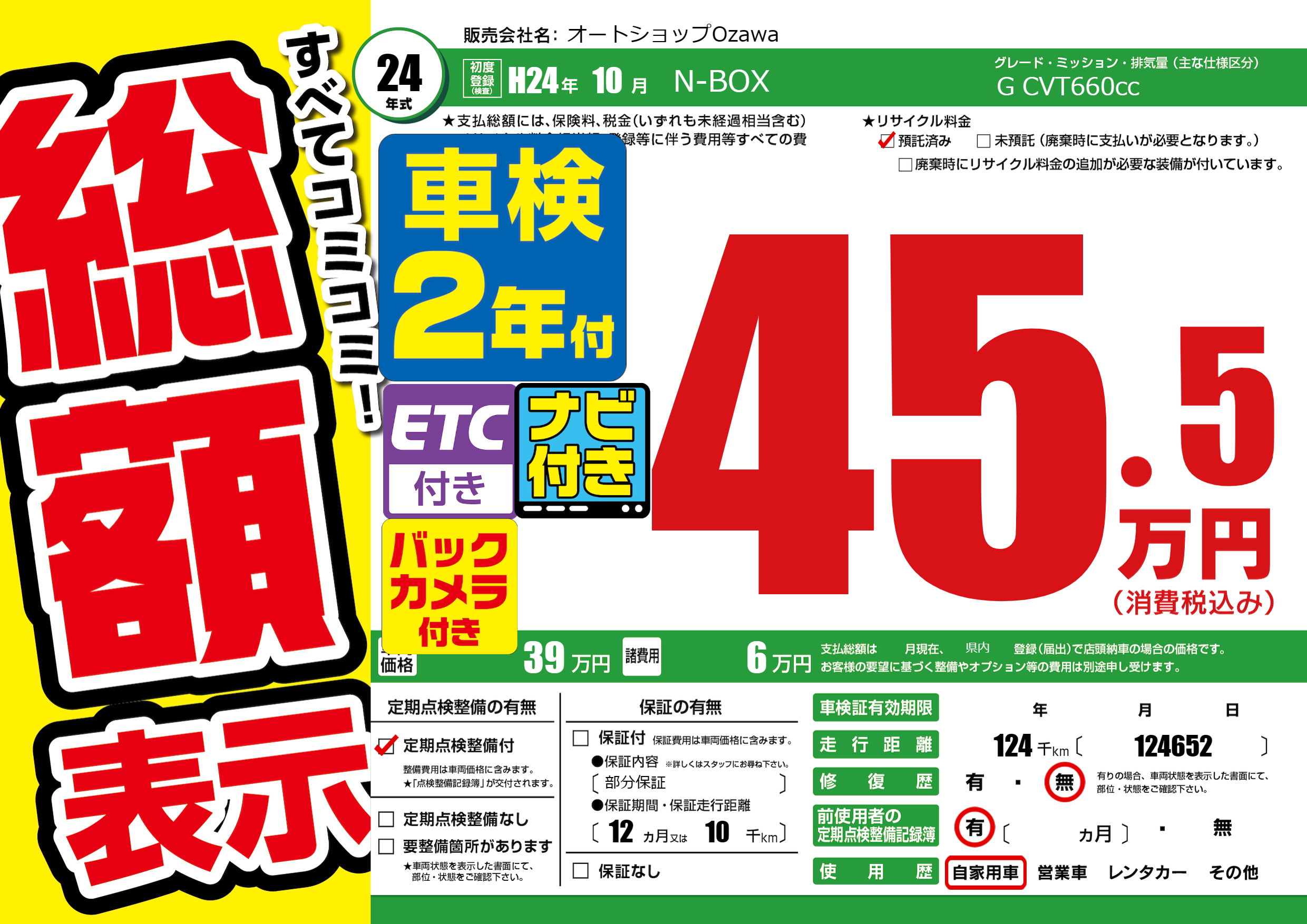 | 車名 | N-BOX | グレード ミッション 排気量 |