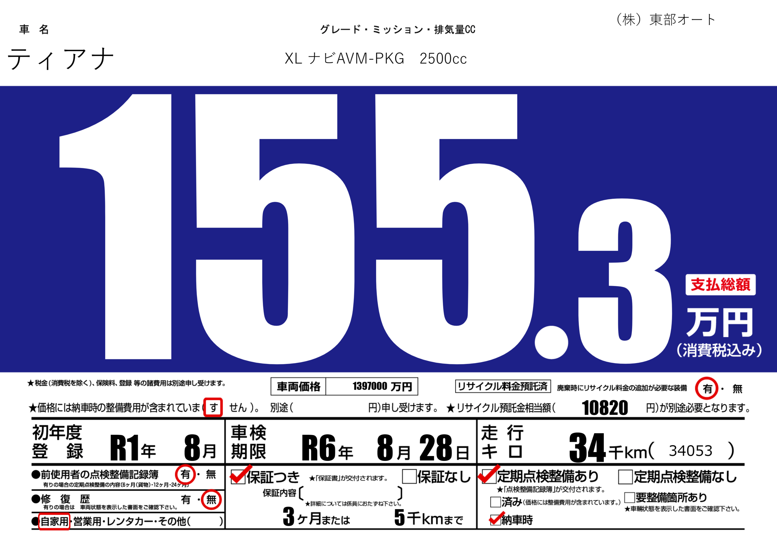 | 車名 | ティアナ | グレード ミッション 排気量 |