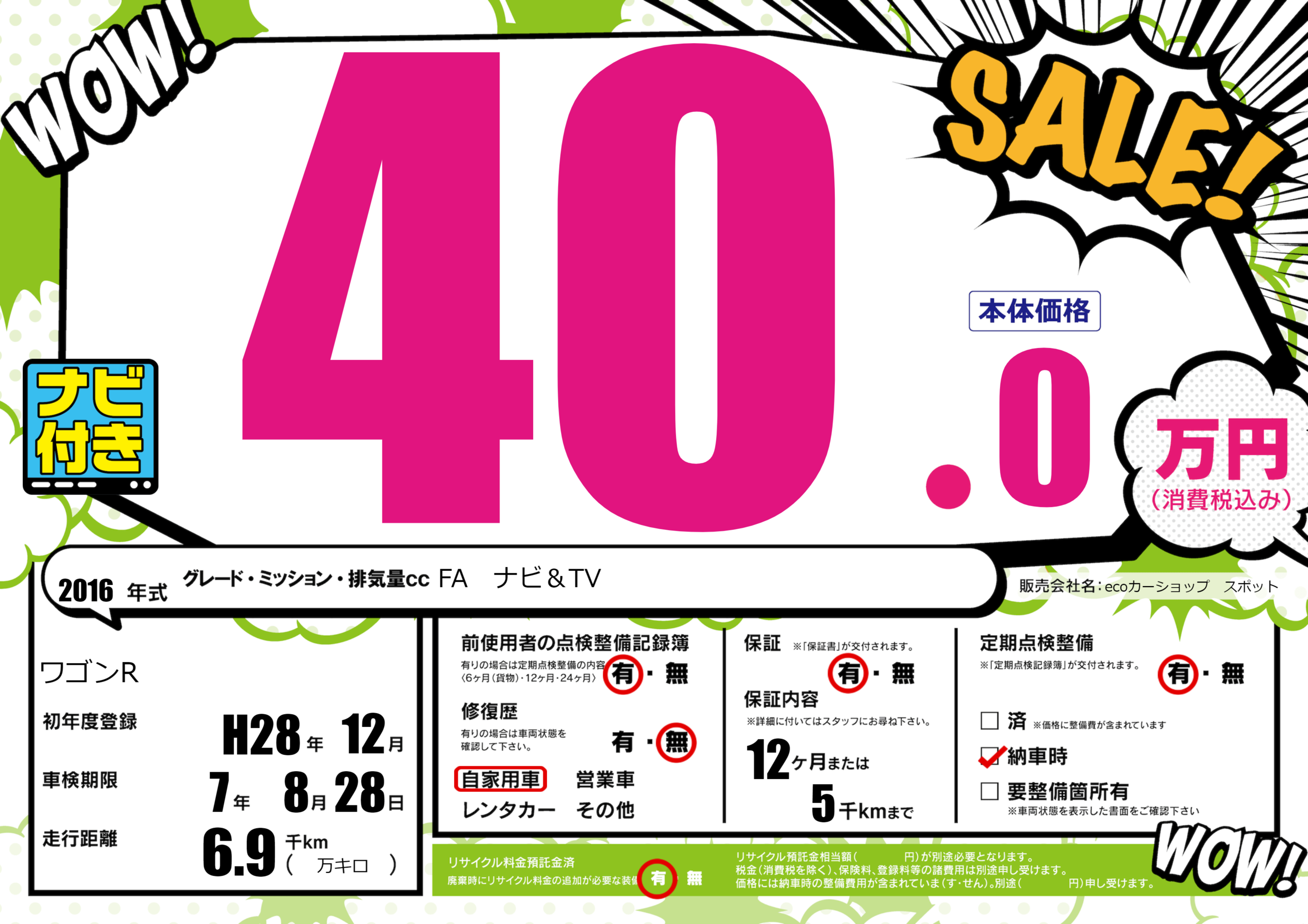 | 車名 | ワゴンR | グレード ミッション 排気量 |