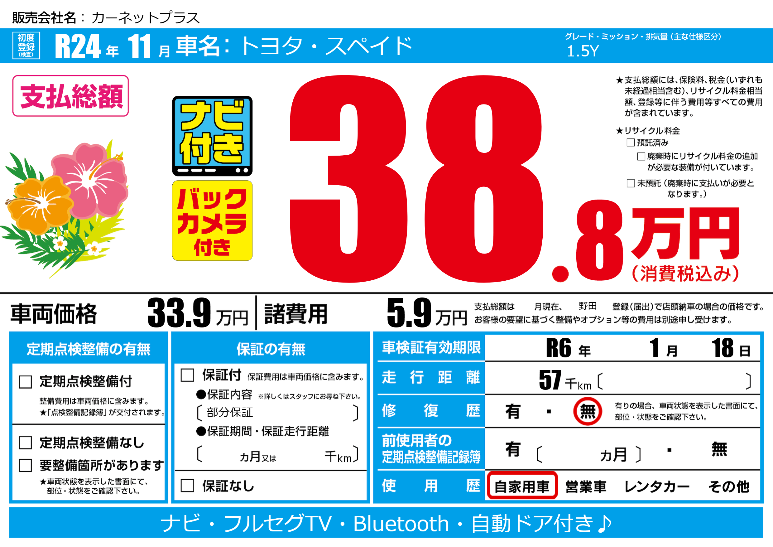 | 車名 | トヨタ・スペイド | グレード ミッション 排気量 |
