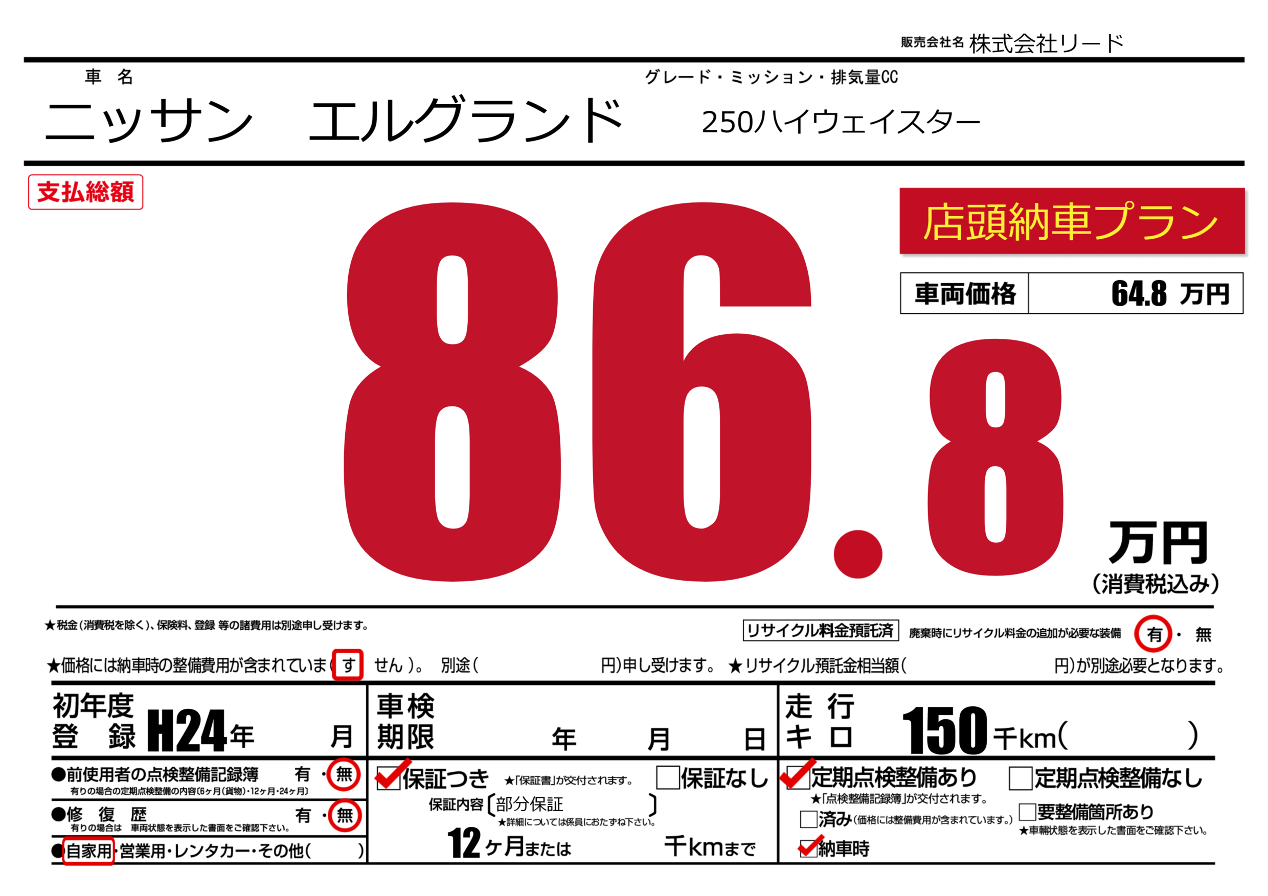 | 車名 | ニッサン エルグランド | グレード ミッション 排気量 |