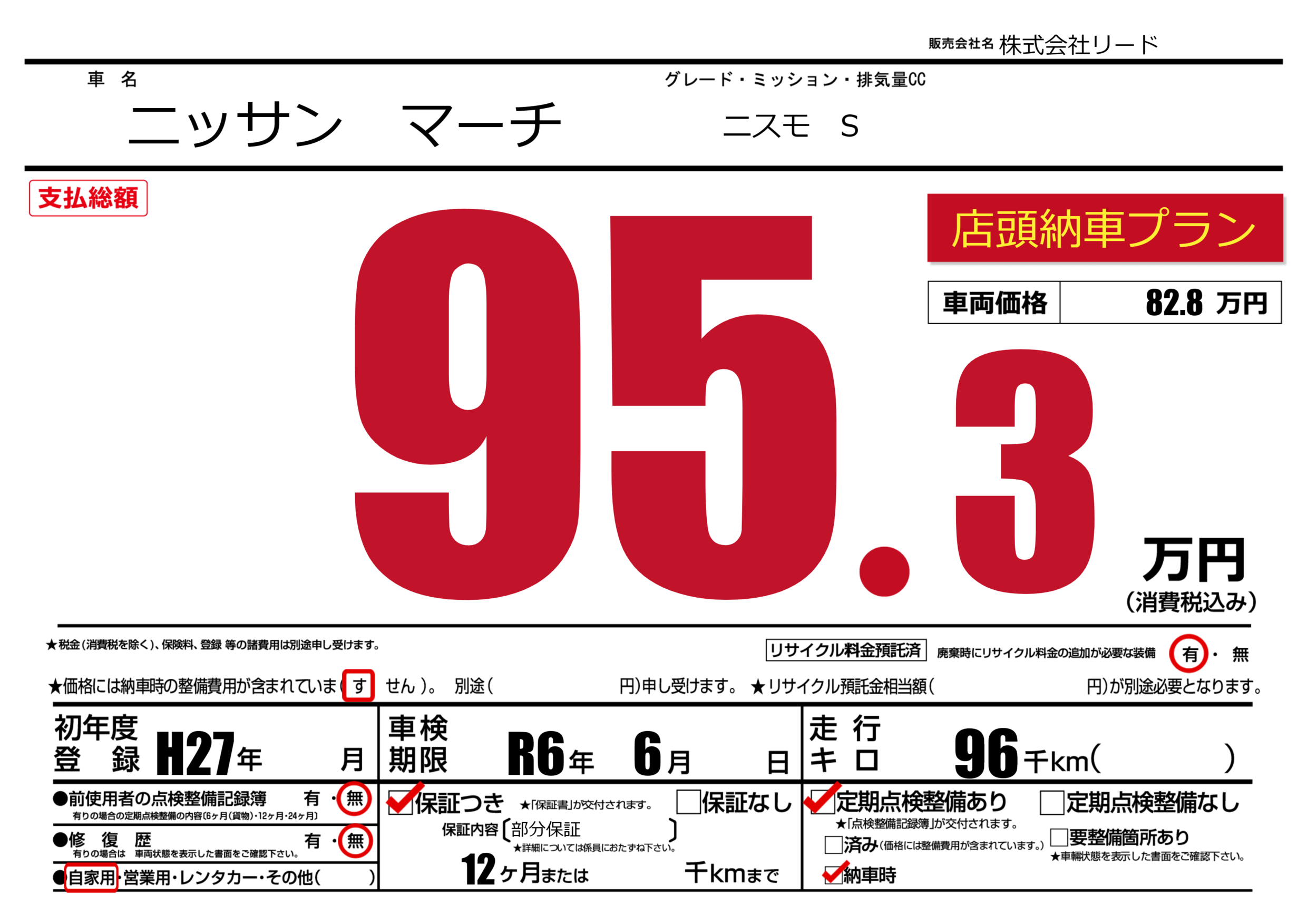 | 定期点検整備 | 定期点検整備あり 納車時あり | ||