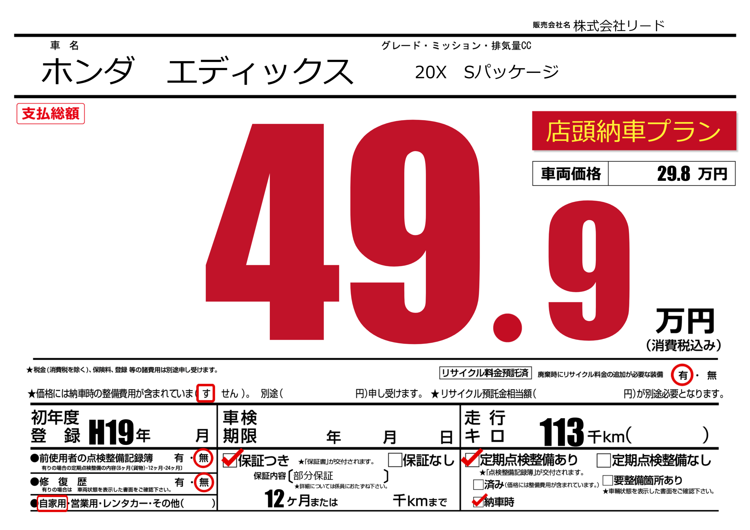 | 車名 | ホンダ エディックス | グレード ミッション 排気量 |