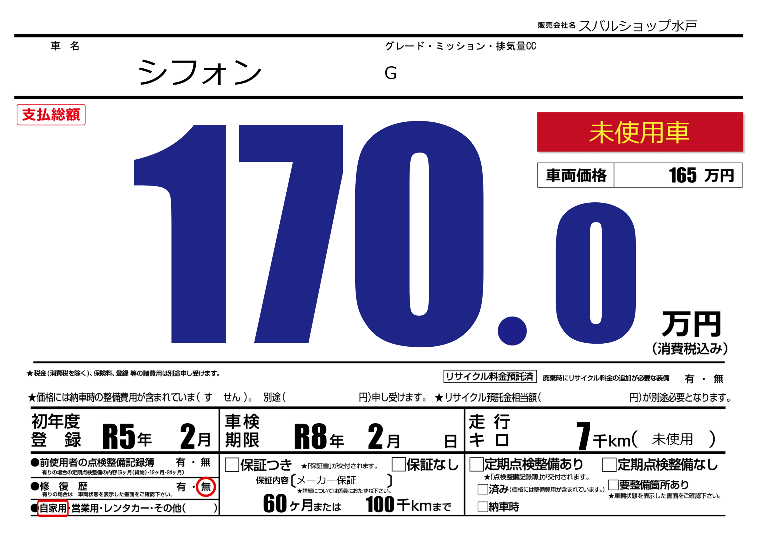 | 車名 | シフォン | グレード ミッション 排気量 |