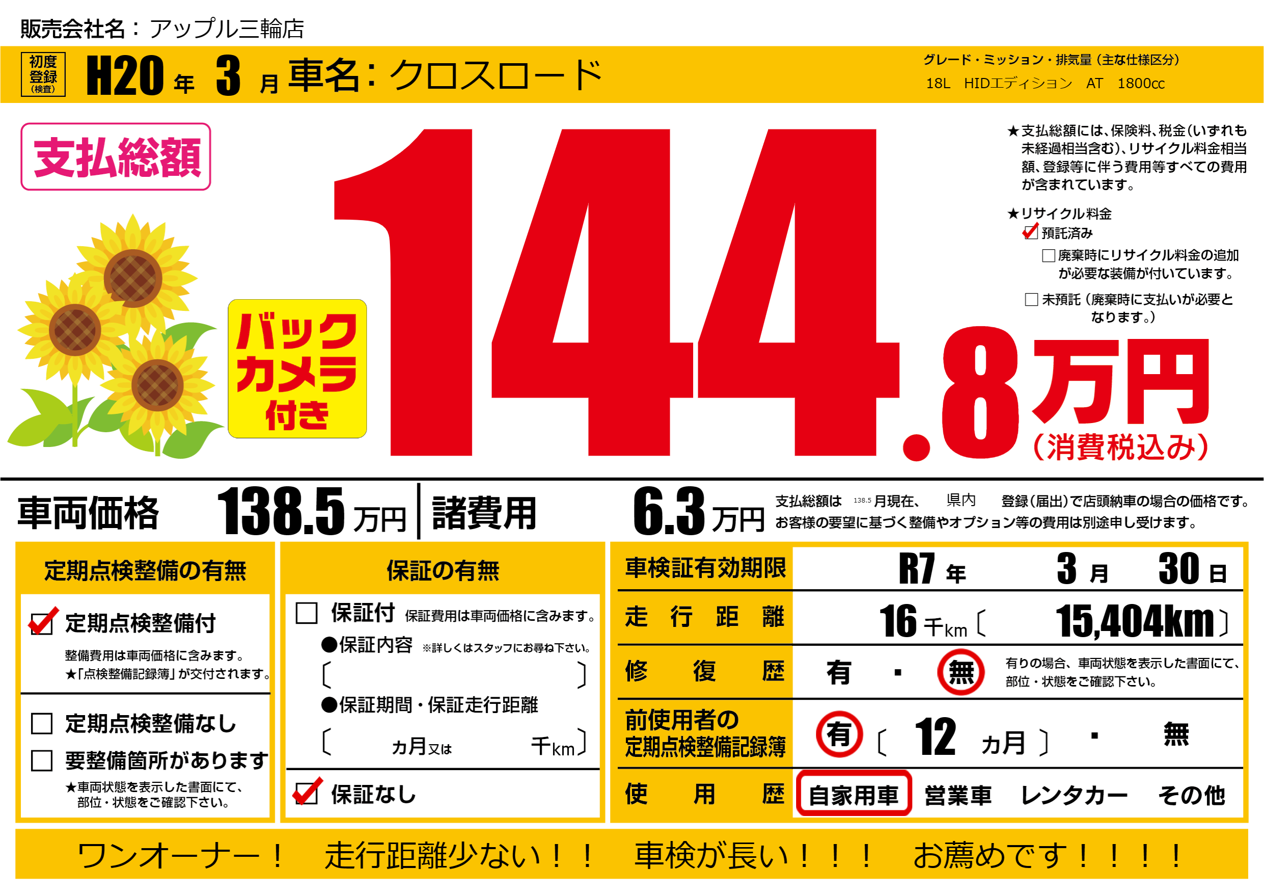 | 走行キロ | 1.6万km | 初年度登録 | H20年3月 |
