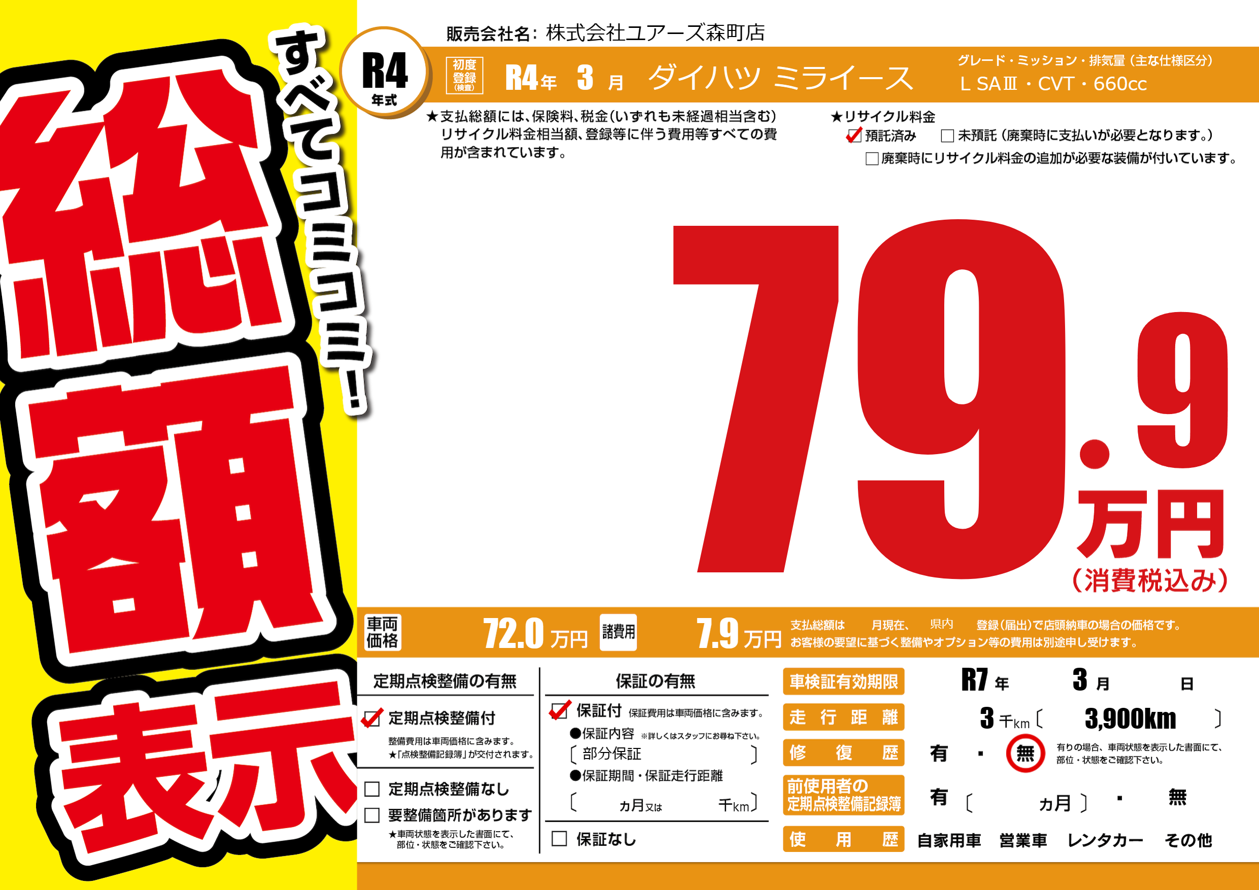 | 走行キロ | 0.3万km | 初年度登録 | R4年3月 |