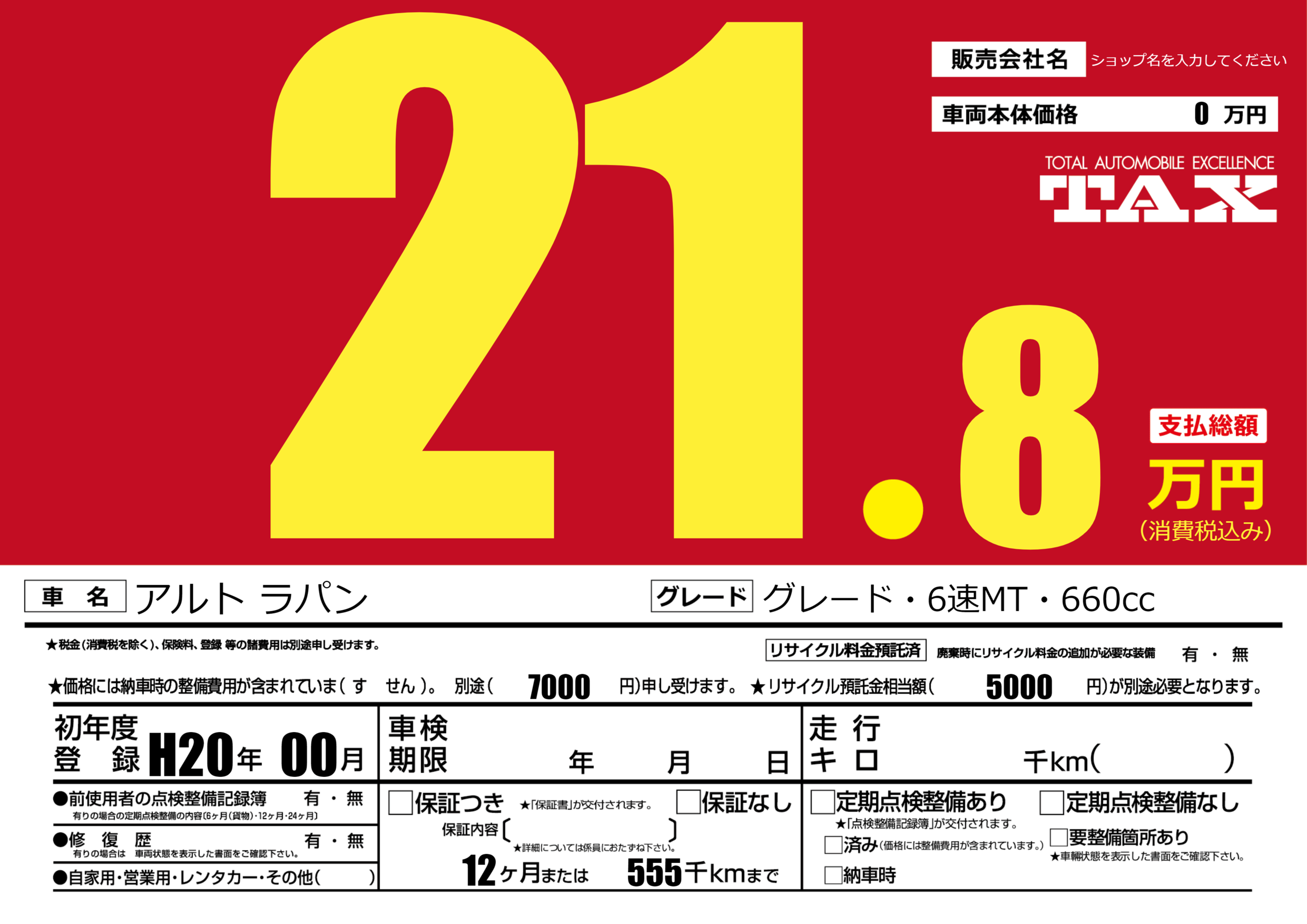 | 走行キロ | - | 初年度登録 | H20年00月 |