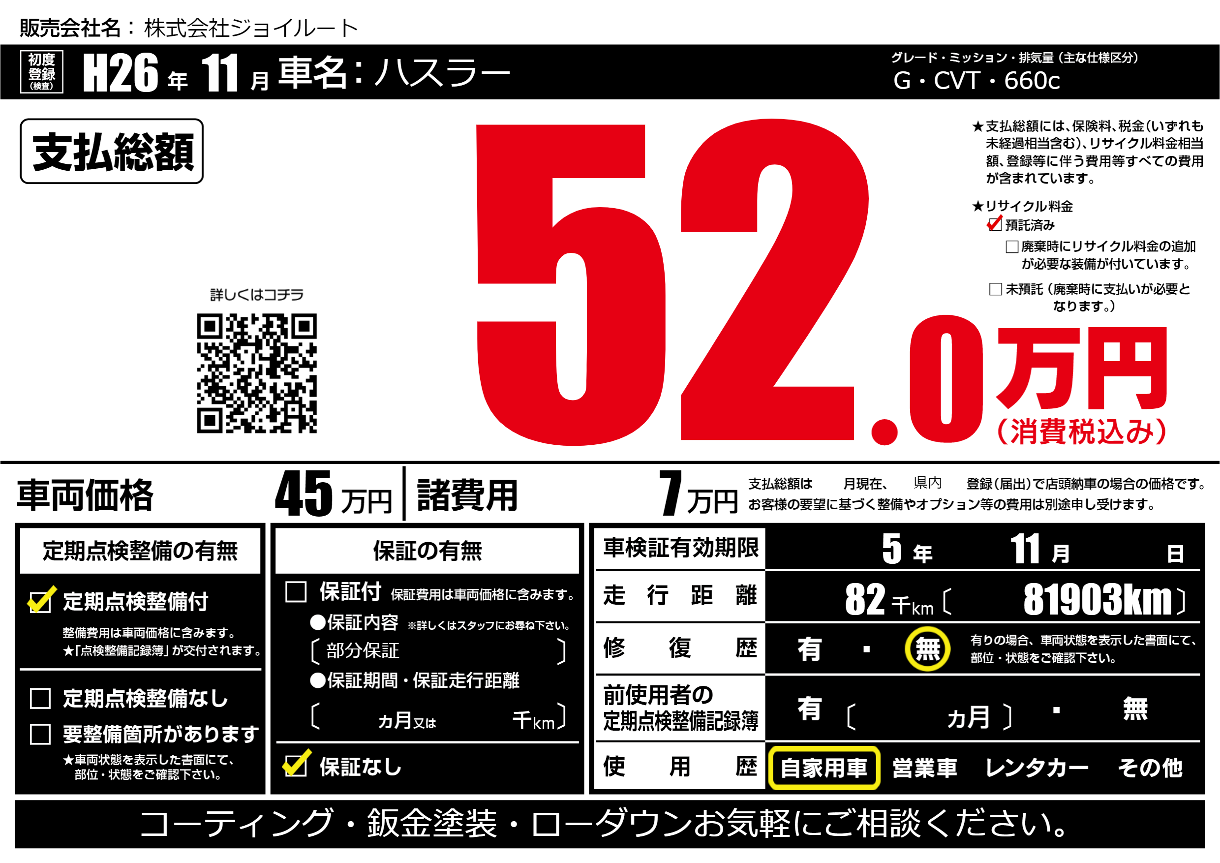 | 車名 | ハスラー | グレード ミッション 排気量 |