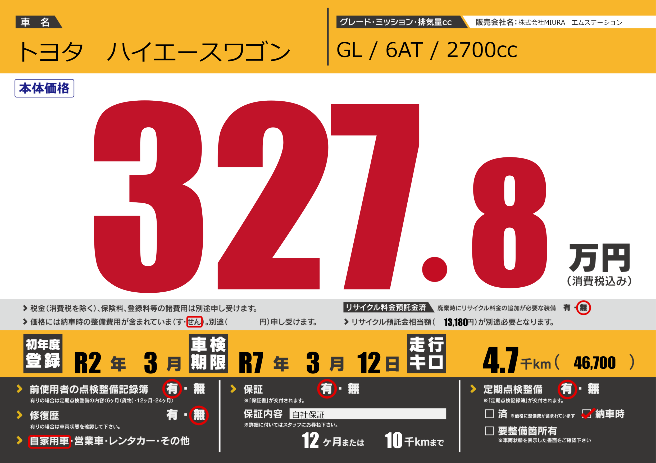 なし | 車検制限 | R7年3月12月 |