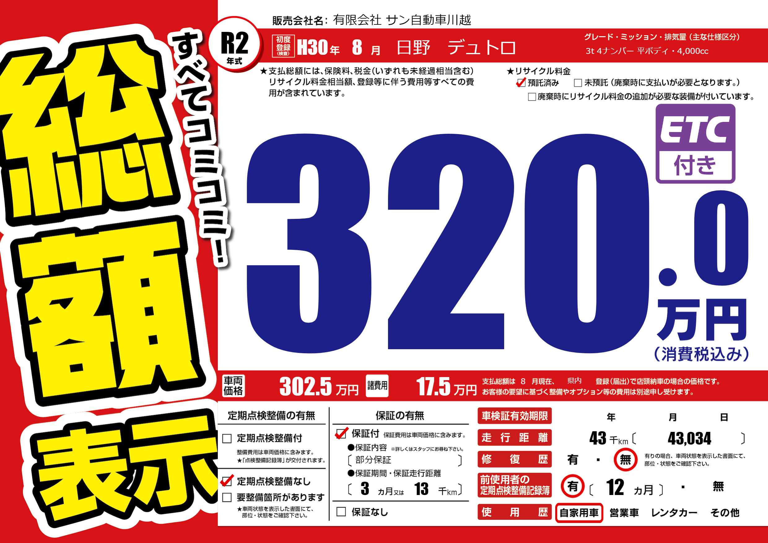 | 車名 | 日野 デュトロ | グレード ミッション 排気量 |