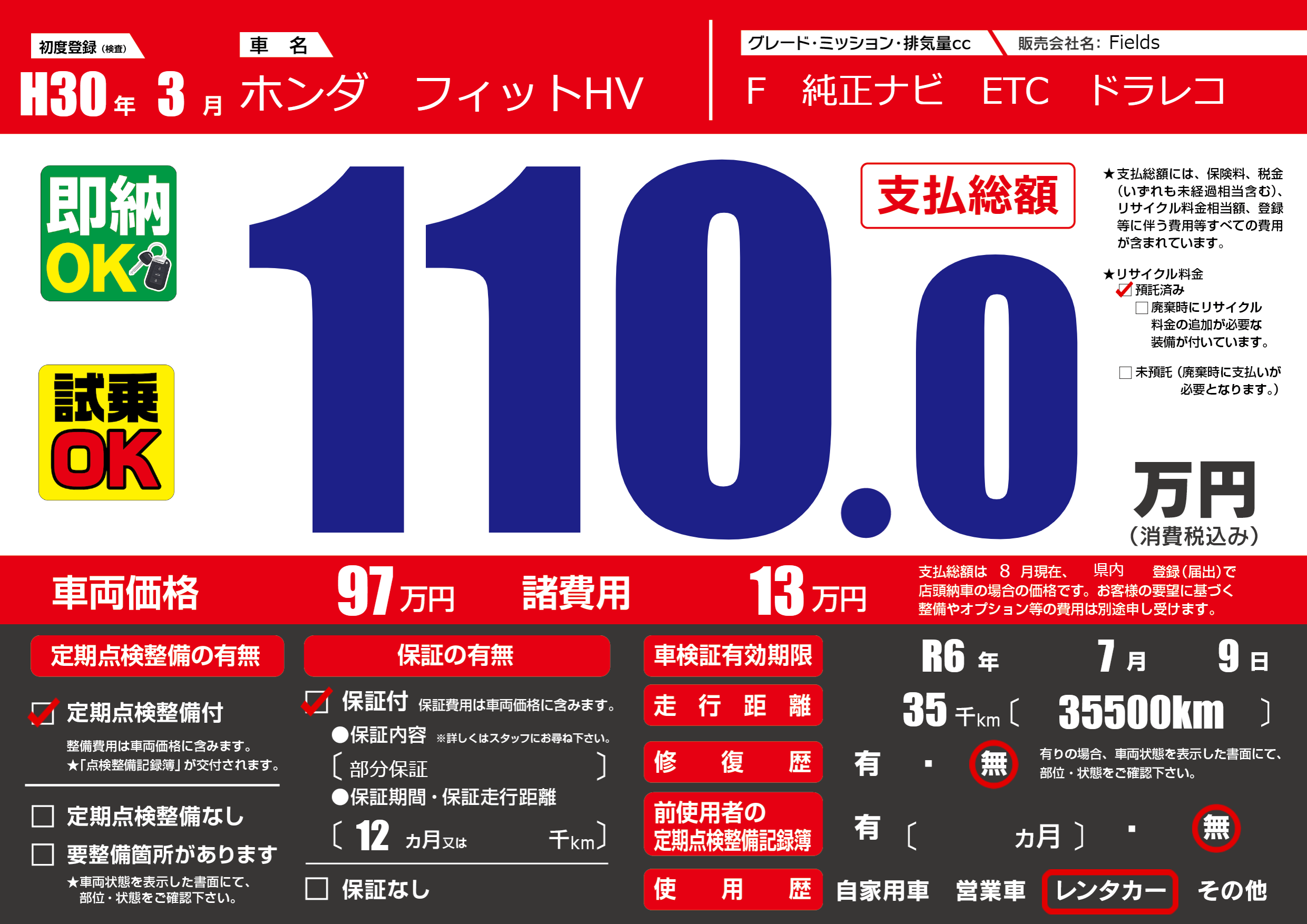 | 走行キロ | 3.5万km | 初年度登録 | H30年3月 |