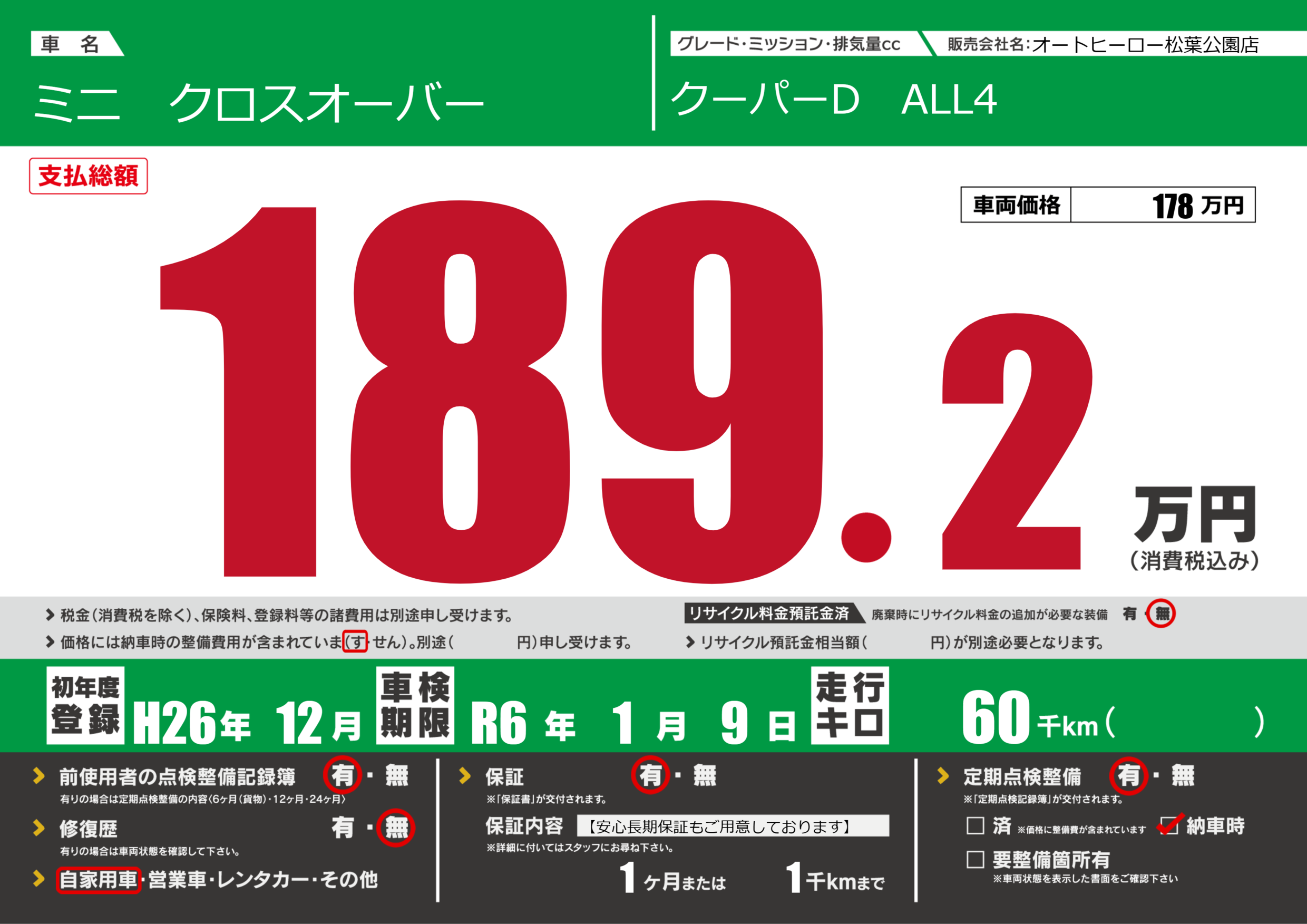 | 車名 | ミニ クロスオーバー | グレード ミッション 排気量 |