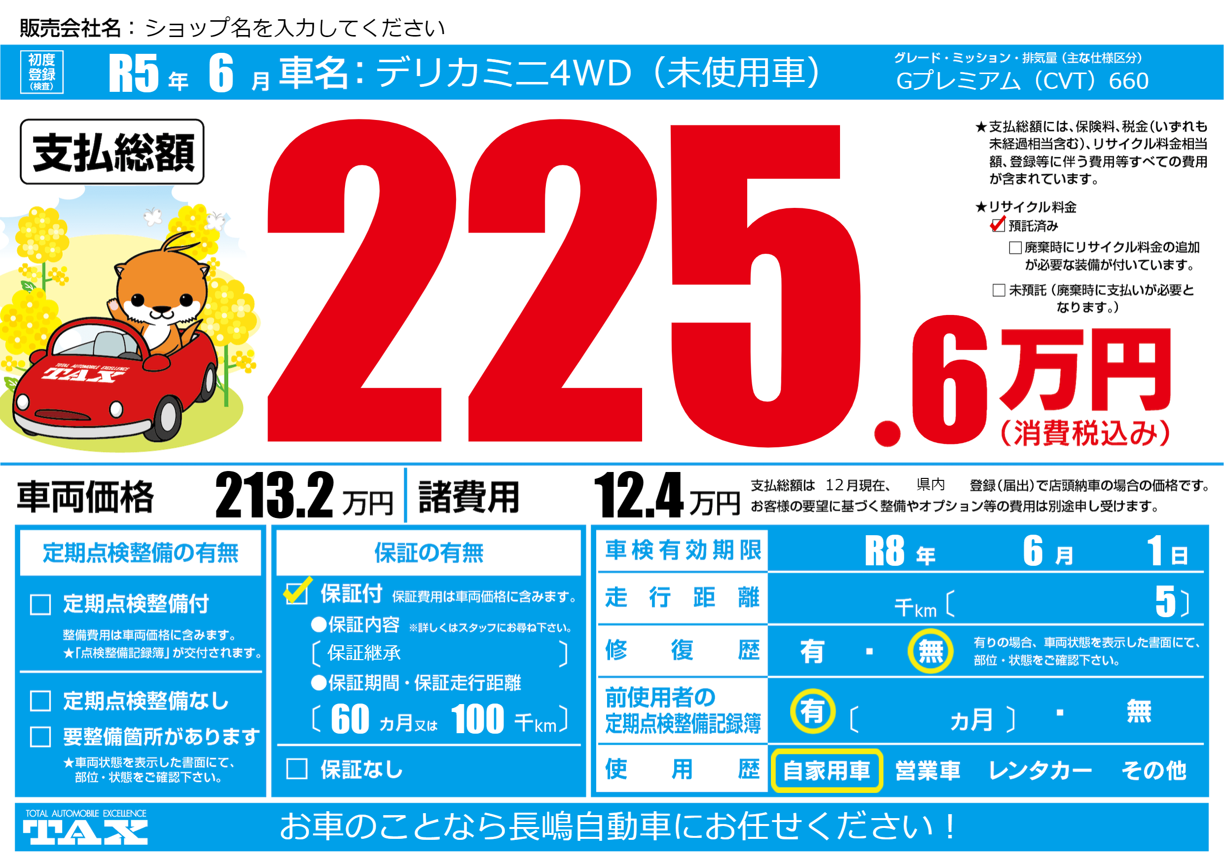 | 車名 | デリカミニ4WD(未使用車) | グレード ミッション 排気量 |