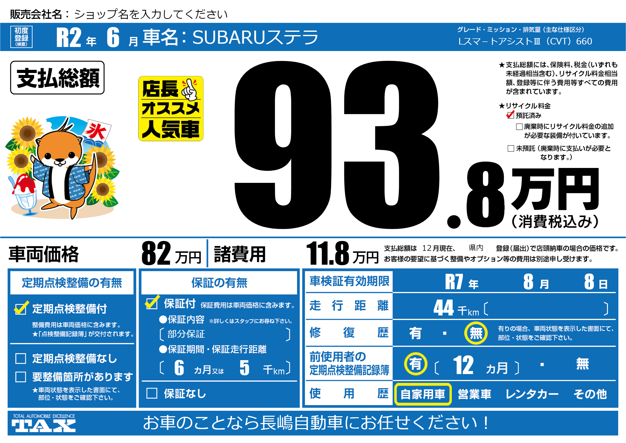 | 車名 | SUBARUステラ | グレード ミッション 排気量 |