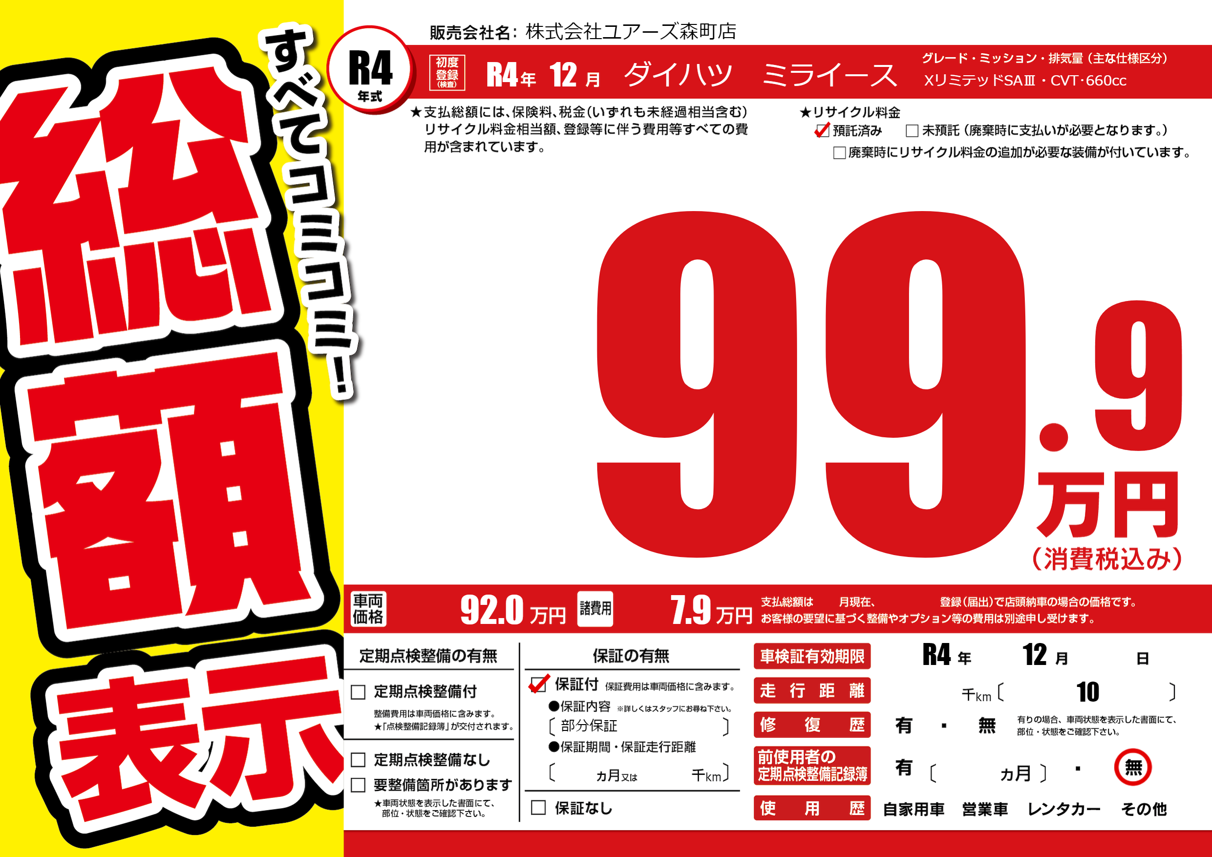 保証付き 保証内容(部分保証) ---ヶ月または()千kmまで |